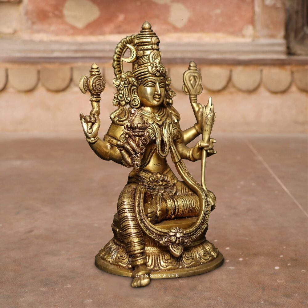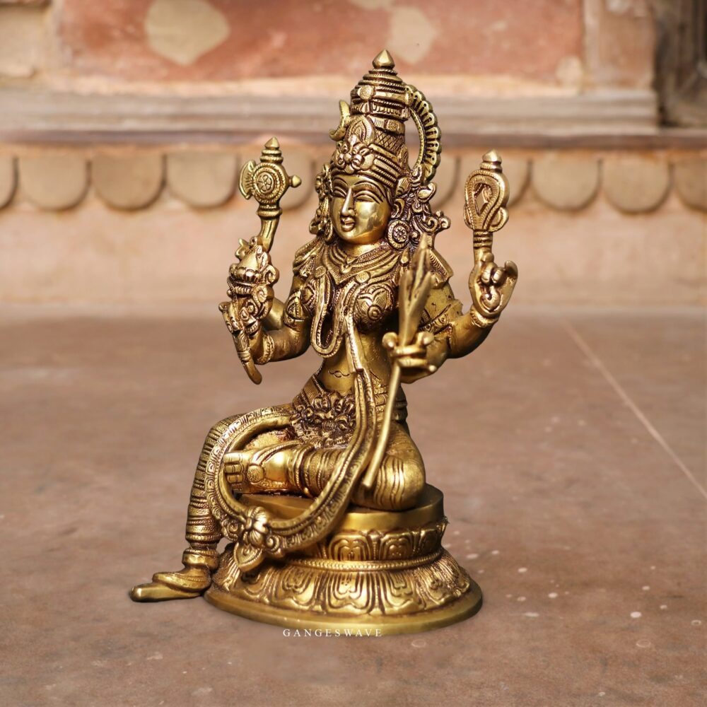 Exquisitely handcrafted brass statue of goddess Raj Rajeswari, the epitome of power and compassion. Meticulously sculpted by skilled artisans, this beautiful idol captures the goddess in a poised and serene stance, adorned with intricate details that reflect her majestic aura.