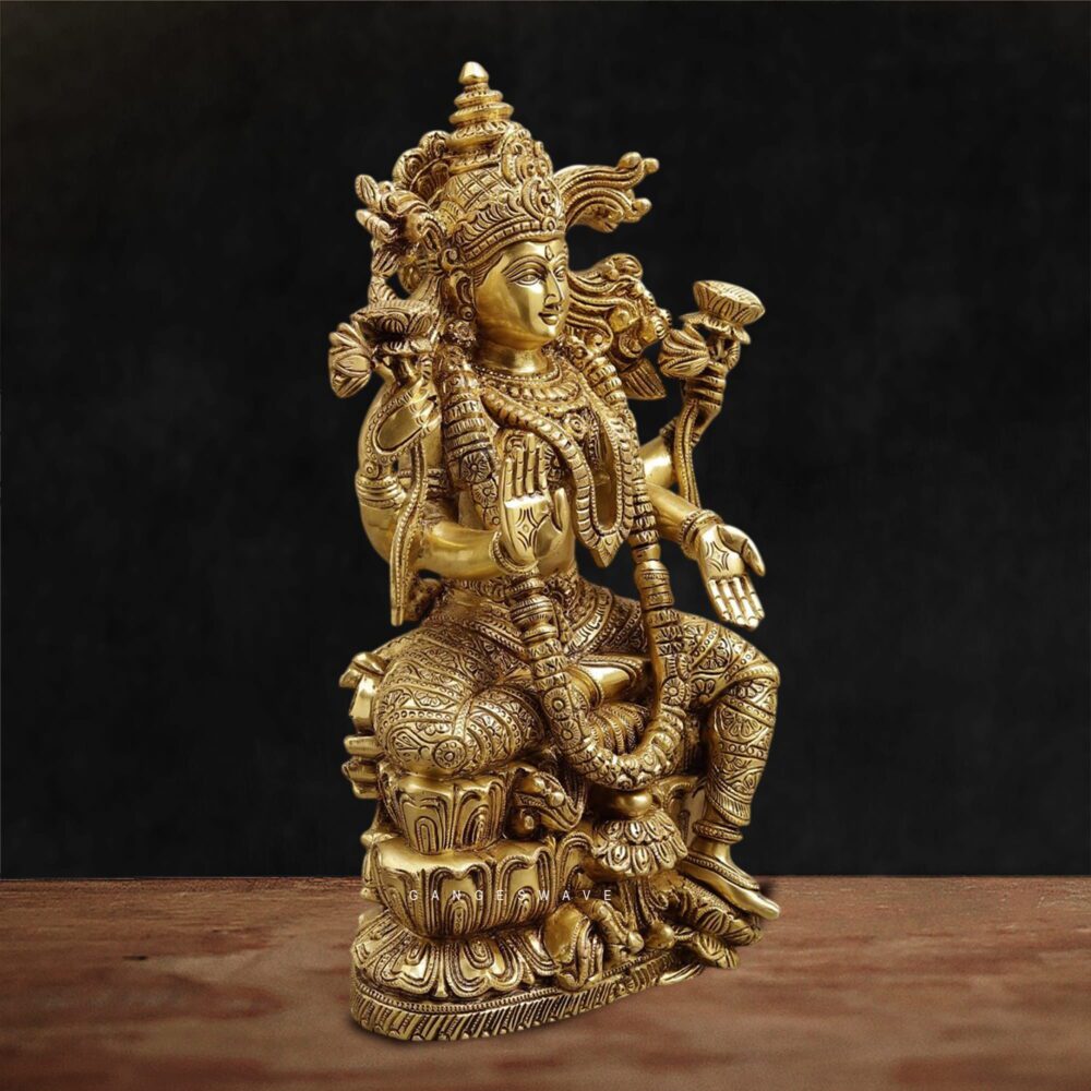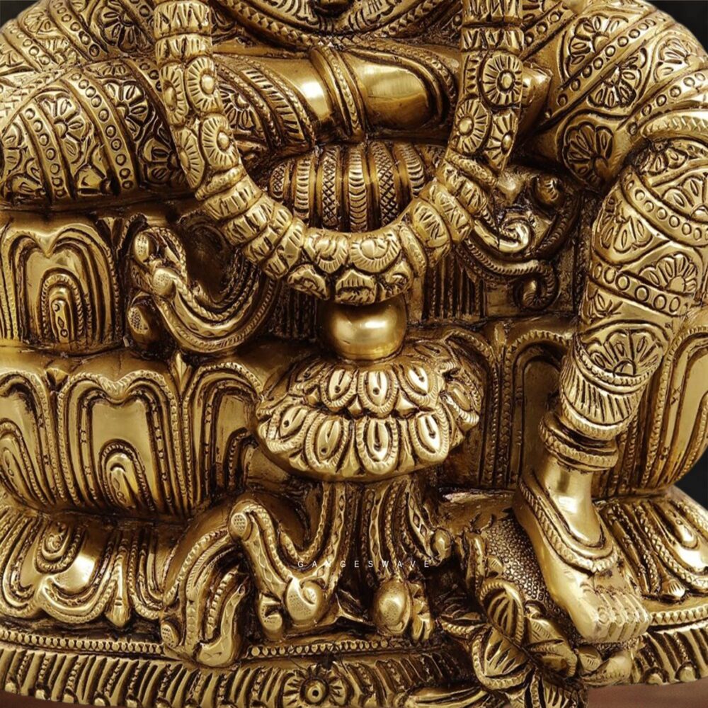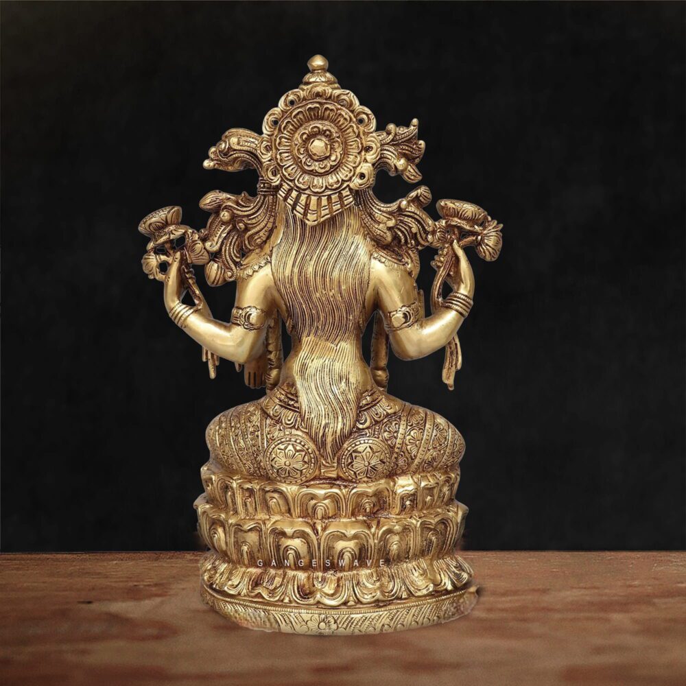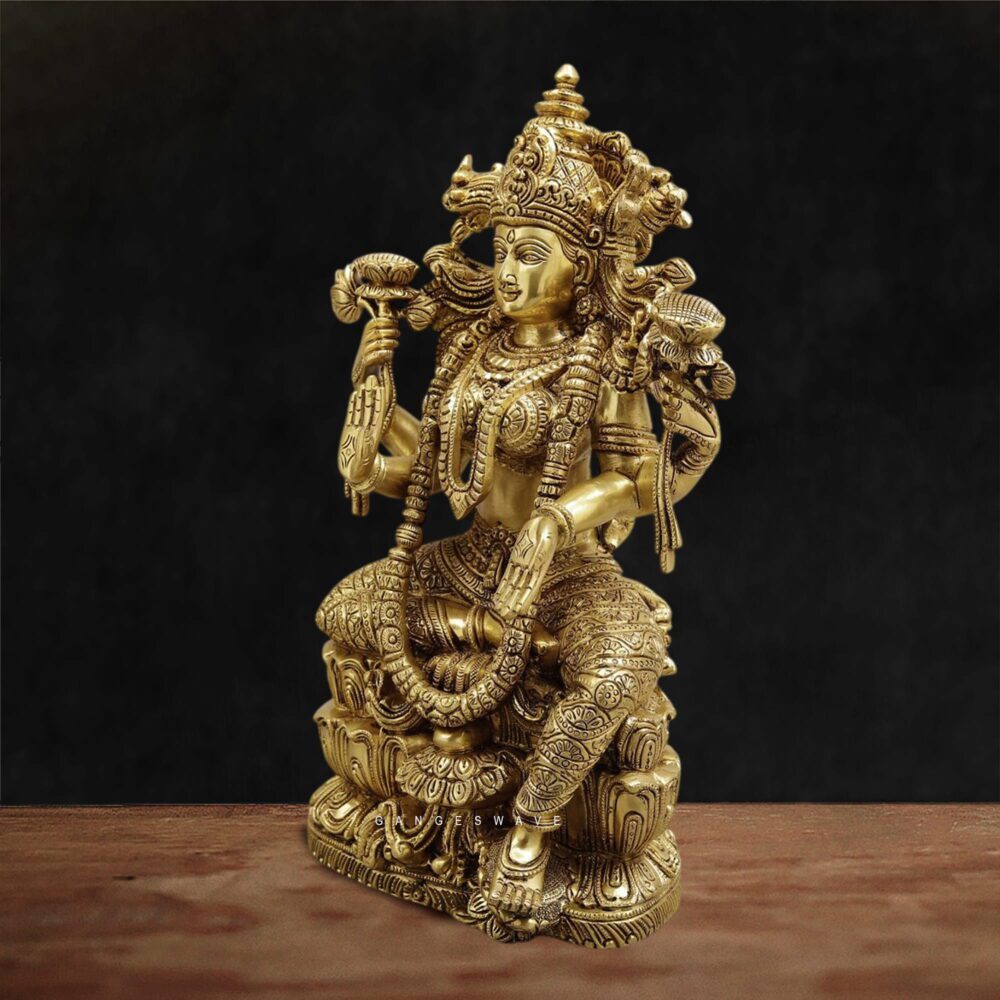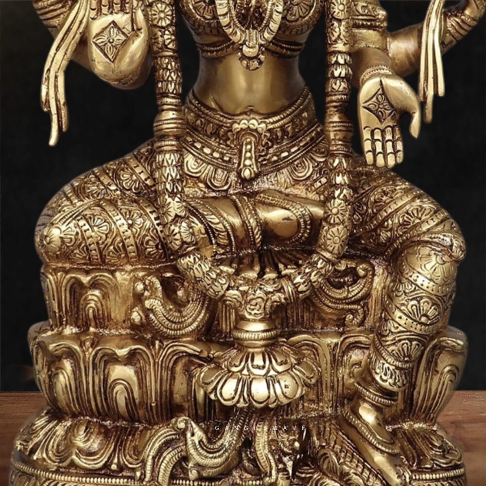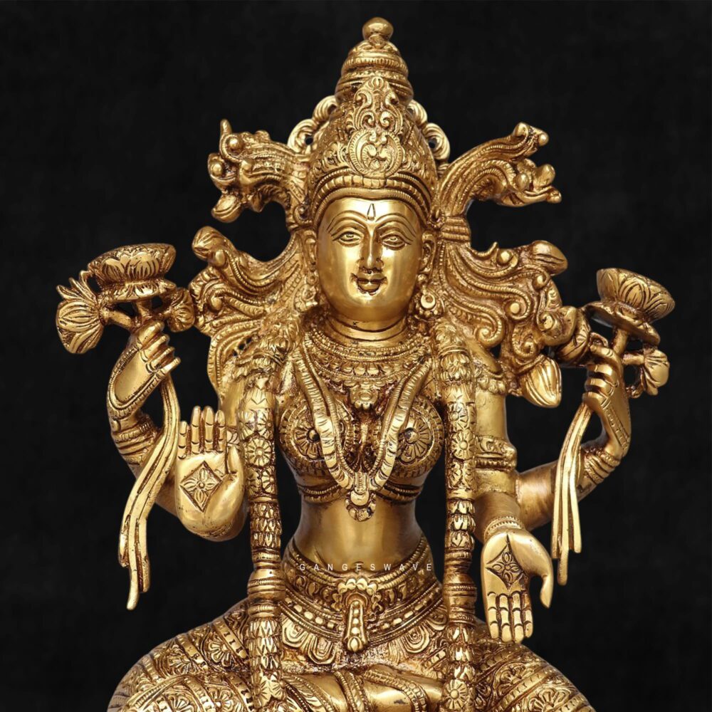 Superfine Brass Goddess Lakshmi Idol, a masterpiece of traditional Indian craftsmanship. This intricately handcrafted brass statue of Goddess Lakshmi symbolizes wealth, fortune, prosperity, and auspiciousness, making it perfect for home temples, pooja rooms, offices, and luxury interior décor. This premium brass Lakshmi murti is crafted with exceptional detailing, from the ornate crown and jewelry to the lotus pedestal and symbolic hand gestures representing blessings, wealth, and protection. The statue showcases traditional South Indian temple art styling, making it a timeless collectible and spiritual décor piece.