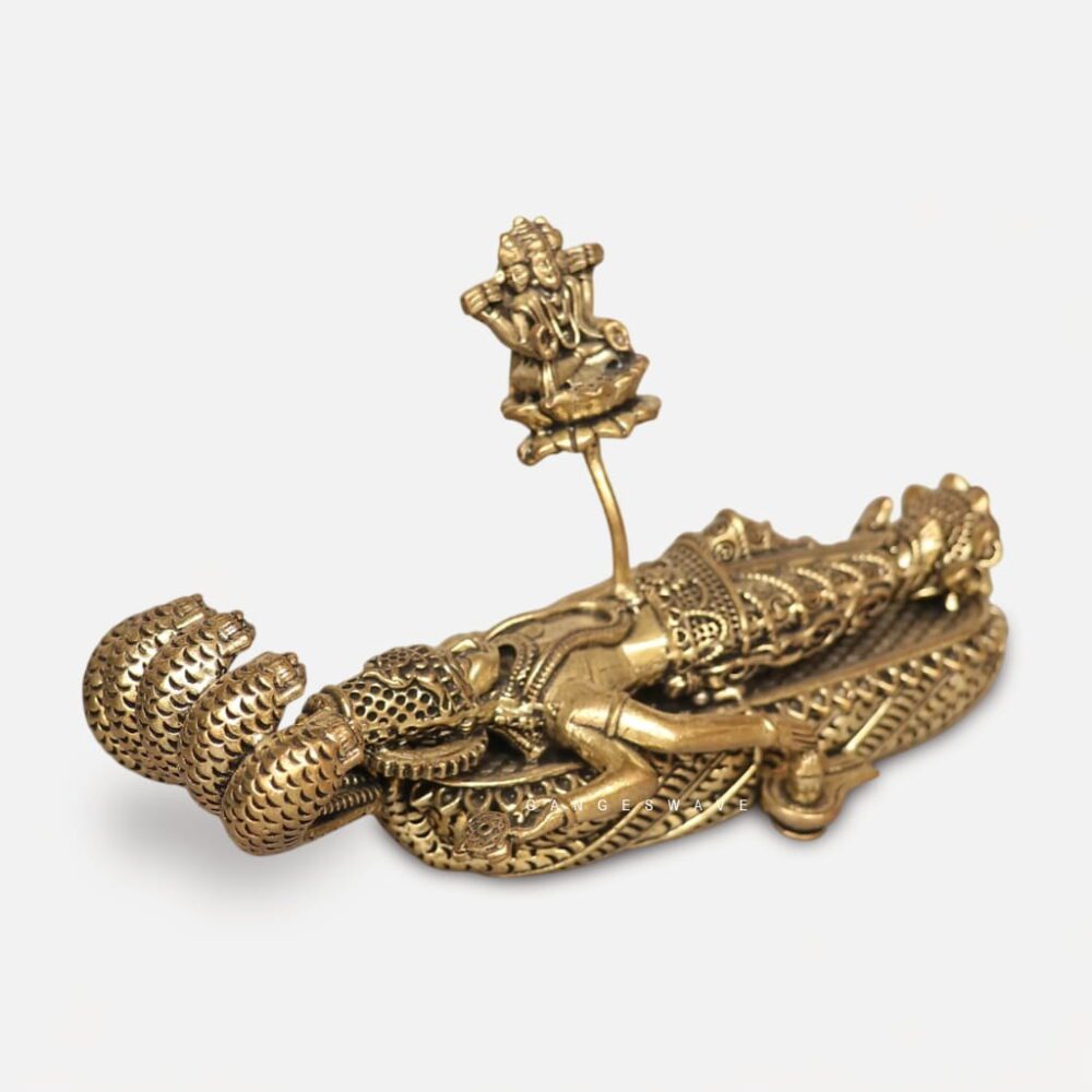 Brass Vishnu Sleeping on Sheshnaag Idol, a sacred representation of Lord Vishnu in his Anant Shayana posture. A miniature idol of Goddess Lakshmi seated near Vishnu enhances the spiritual significance, symbolizing prosperity and divine grace.
