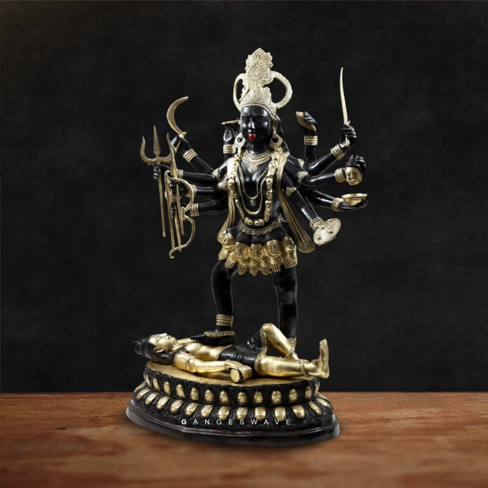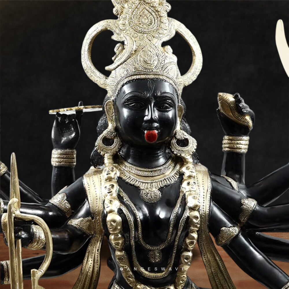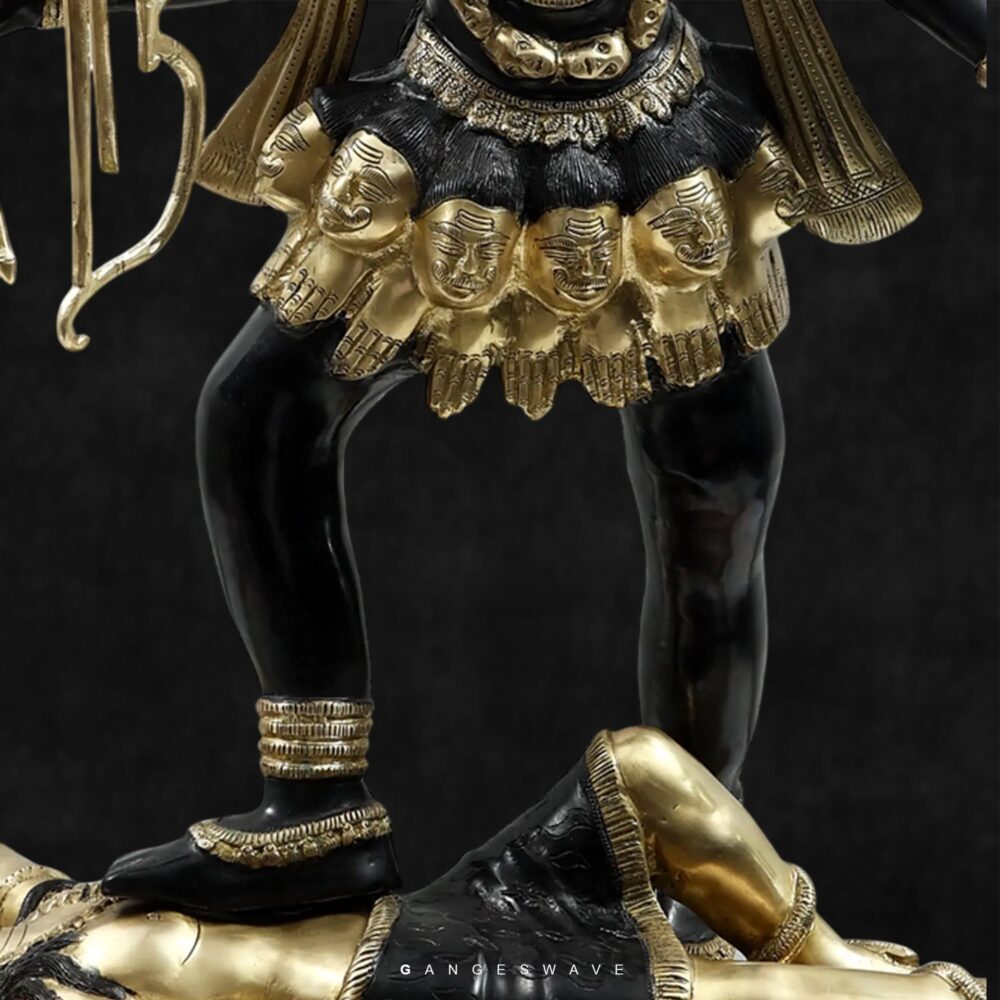 This majestic brass Kali Murti captures the fierce yet protective essence of Goddess Kali—destroyer of evil and mother of liberation. Depicted in dynamic black and antique gold tones, she stands triumphantly over Shiva, symbolizing the triumph of divine power over ego. Handcrafted using traditional sand-casting techniques by skilled Indian artisans, this statue reflects unmatched precision and devotion. Ideal for spiritual altars, statement décor, or as a powerful Vastu gift, it radiates fierce protection and transformative energy in any space. A treasured piece for festivals, pujas, or as a centerpiece in luxury interiors.