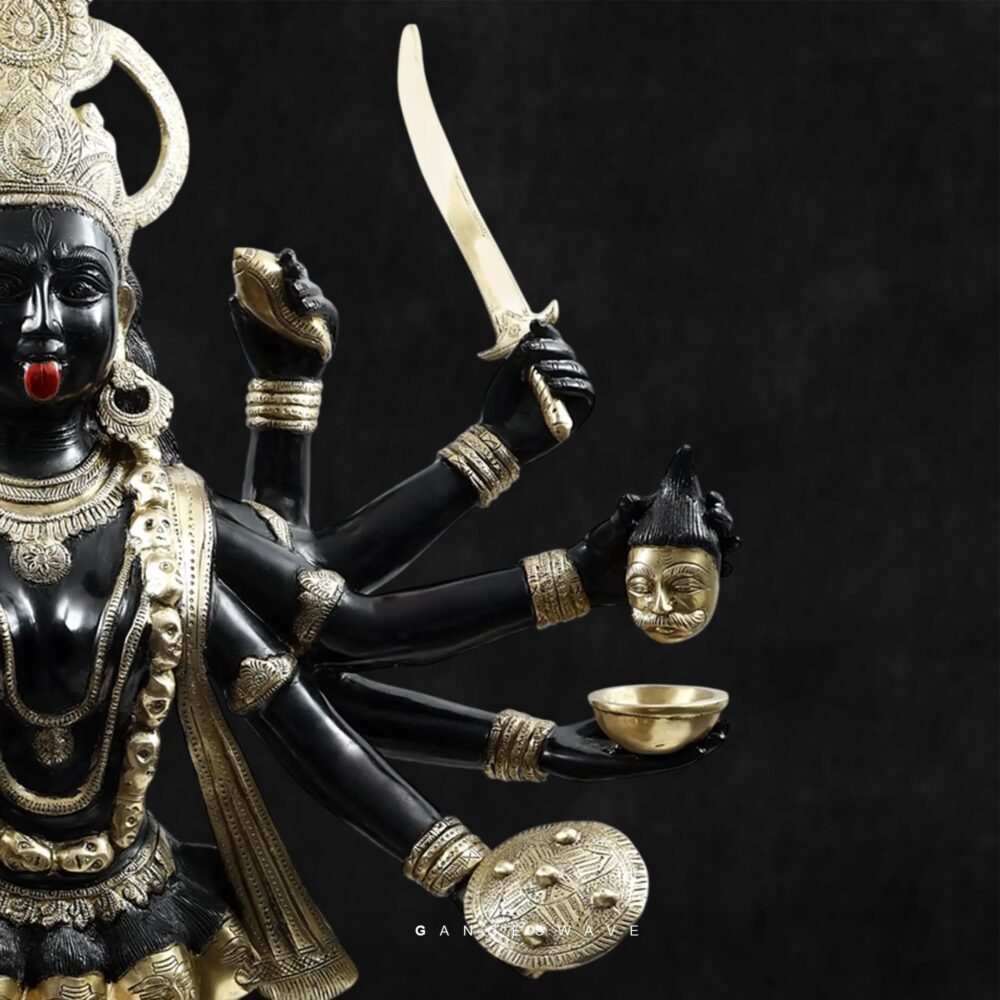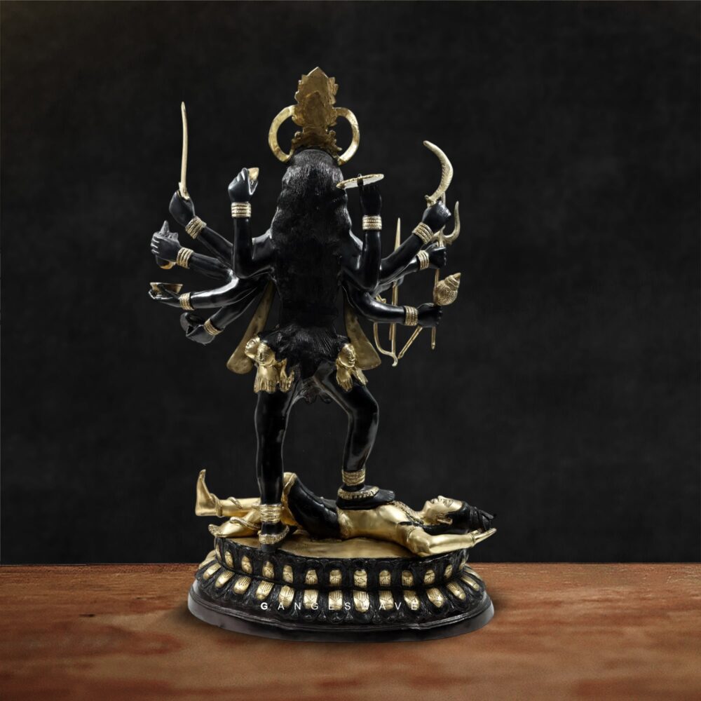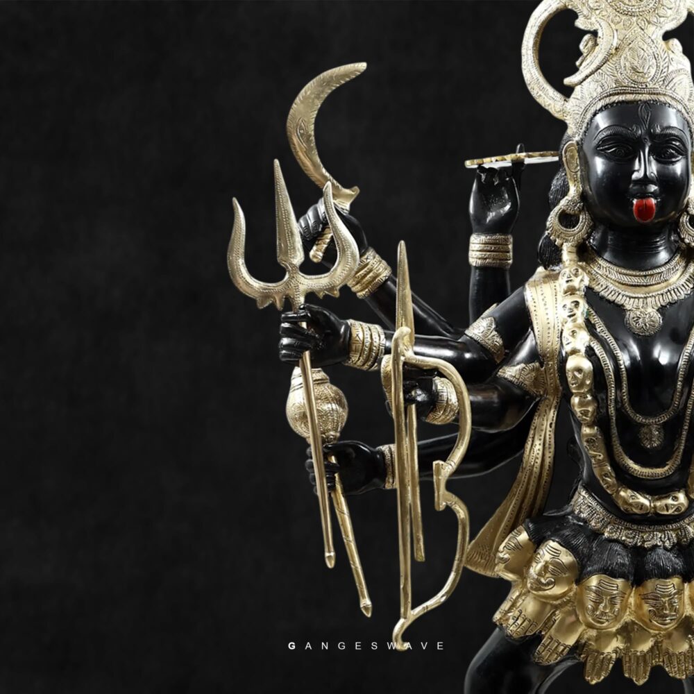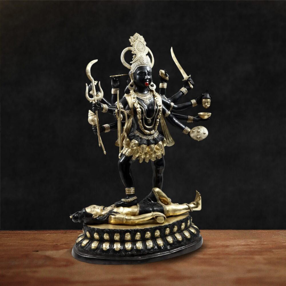This majestic brass Kali Murti captures the fierce yet protective essence of Goddess Kali—destroyer of evil and mother of liberation. Depicted in dynamic black and antique gold tones, she stands triumphantly over Shiva, symbolizing the triumph of divine power over ego. Handcrafted using traditional sand-casting techniques by skilled Indian artisans, this statue reflects unmatched precision and devotion. Ideal for spiritual altars, statement décor, or as a powerful Vastu gift, it radiates fierce protection and transformative energy in any space. A treasured piece for festivals, pujas, or as a centerpiece in luxury interiors.