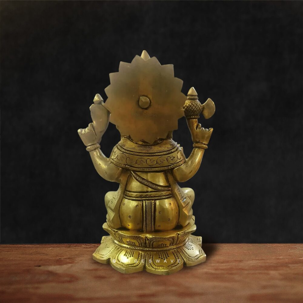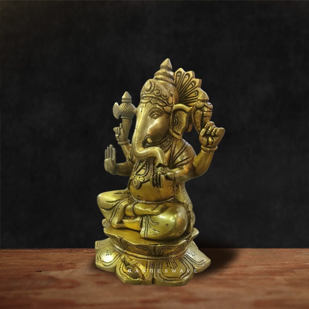 9-inch Handcrafted Pure Brass Ganesha Idol featuring detailed carving and a radiant antique-gold finish. Ideal for home temples, offices, hotels, gifting, and vastu décor. Symbol of prosperity, wisdom, and positive energy.