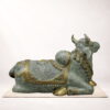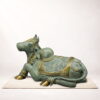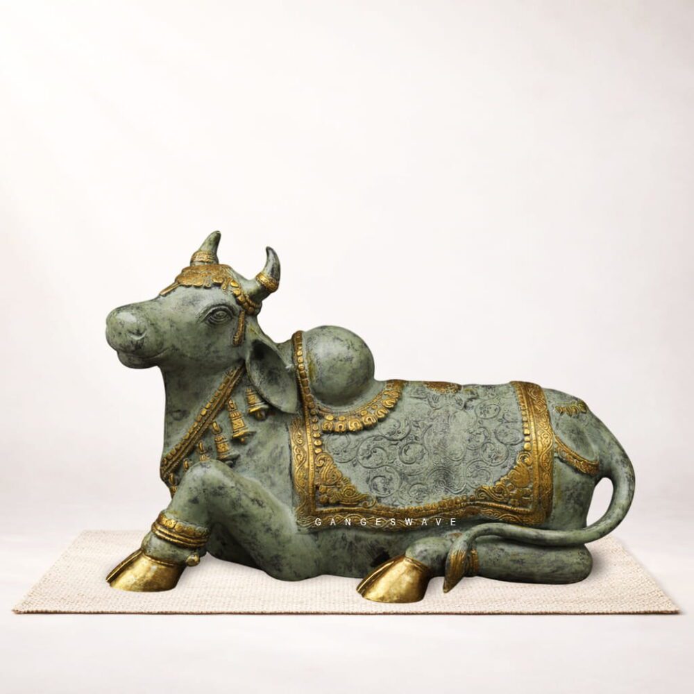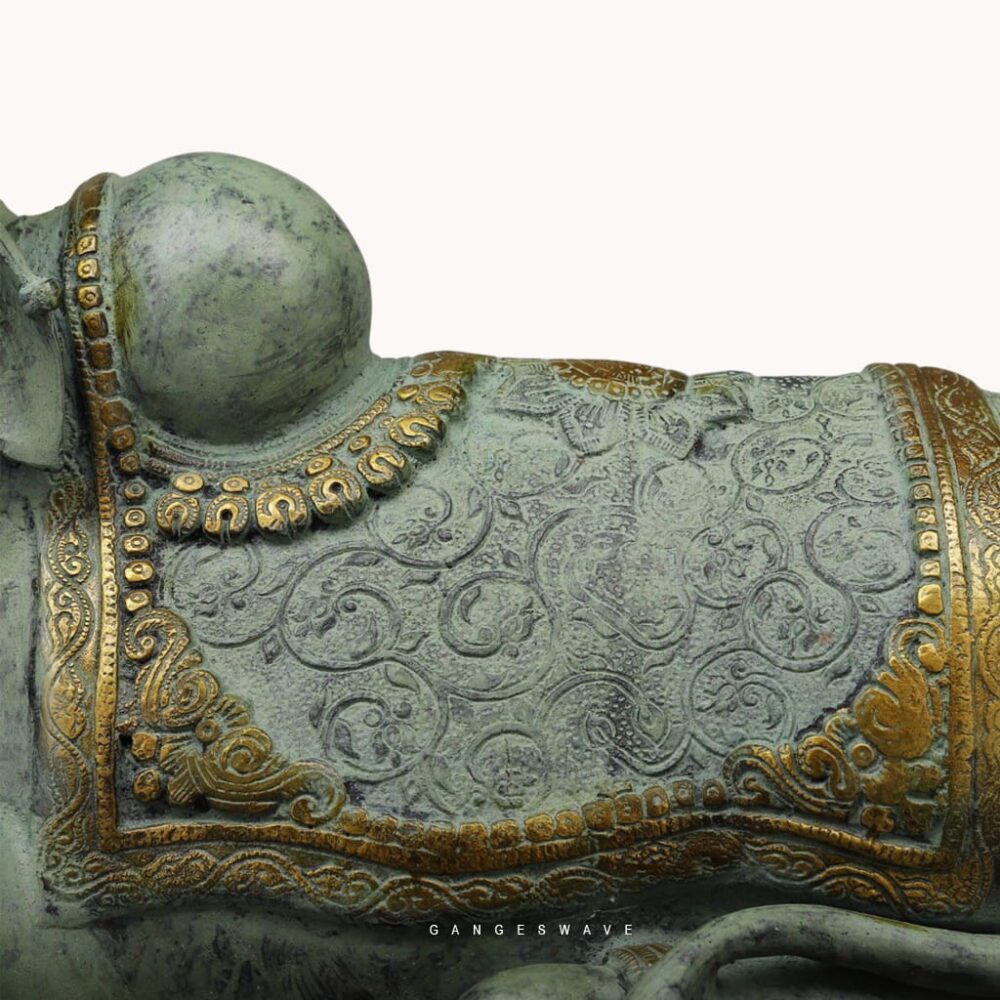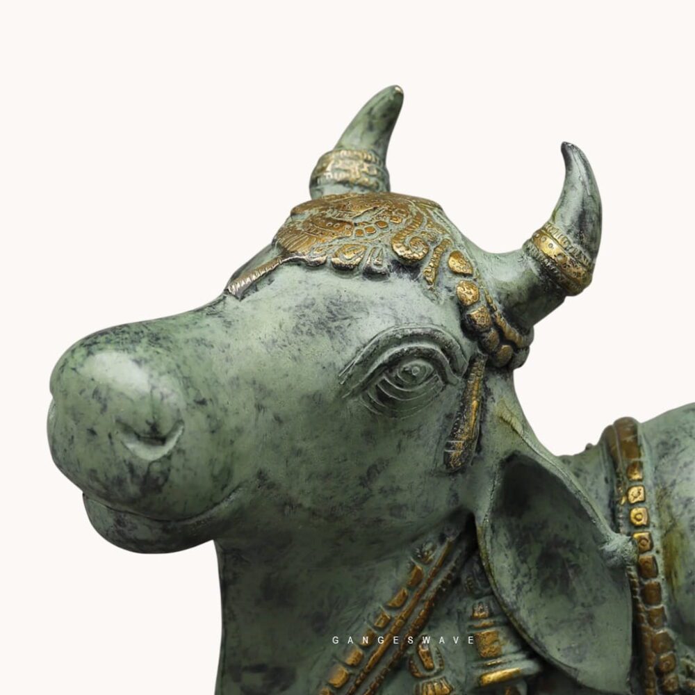 Crafted by skilled artisans using premium brass, the statue features finely carved ornaments, textured detailing, and a dignified seated posture that captures the serenity and majesty associated with Nandi. The antique finish enhances the sculpture’s timeless appeal, making it a perfect addition to luxury homes, spiritual spaces, and curated art collections.