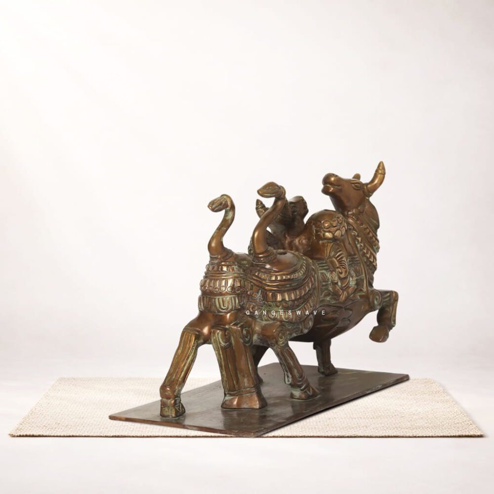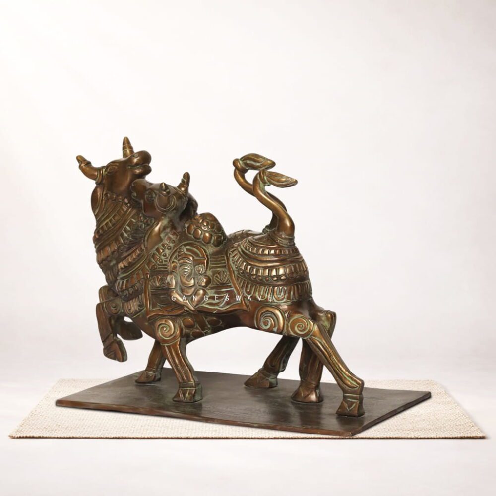 Artistic Brass Nandi Decor, a masterfully handcrafted sculpture inspired by traditional Indian temple art. Representing Nandi, the sacred bull and divine vehicle of Lord Shiva, this exquisite brass artifact symbolizes strength, devotion, prosperity, and spiritual balance. Crafted by skilled artisans using high-quality solid brass, the sculpture features two finely detailed Nandi figures with intricate carvings, ornamental motifs, and an authentic antique patina finish.