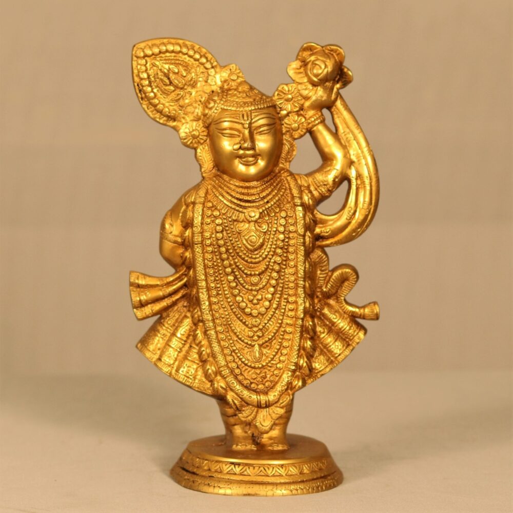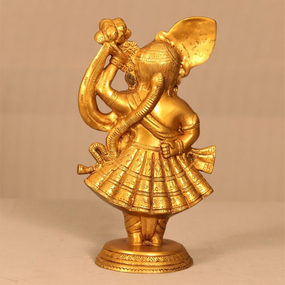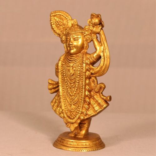 This exceptionally artistic statue is of  Lord Vishnu. Vishnu pervades the entire universe as its soul. All the worlds depend on Vishnu for manifestation, existence and dissolution. While Vishnu has many forms, his four-armed form is most common, which this sculpture depicts. Flames around Shankha and Chakra are indicative of their aura and divinity. This bronze sculpture of Vishnu is very graceful and visually pleasing.