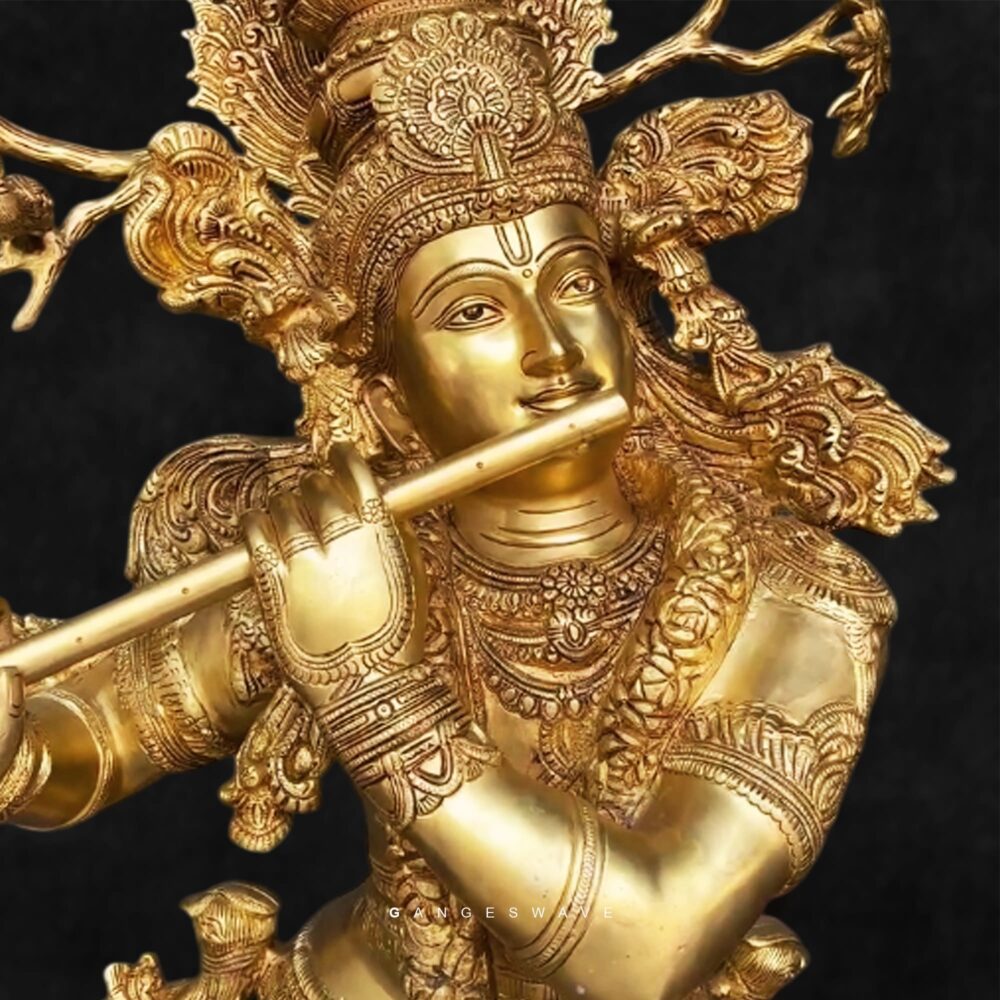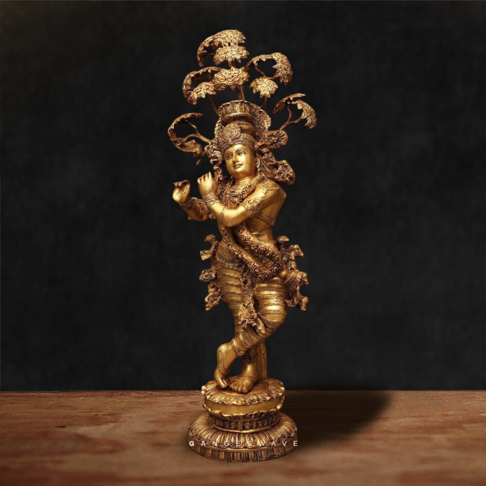 This magnificent Lord Krishna Brass Statue captures the eternal charm of Krishna — the divine flautist — under the graceful Kadamba tree. Every curve, expression, and ornament is meticulously hand-carved by master craftsmen from India’s traditional age-old master brass artisans.