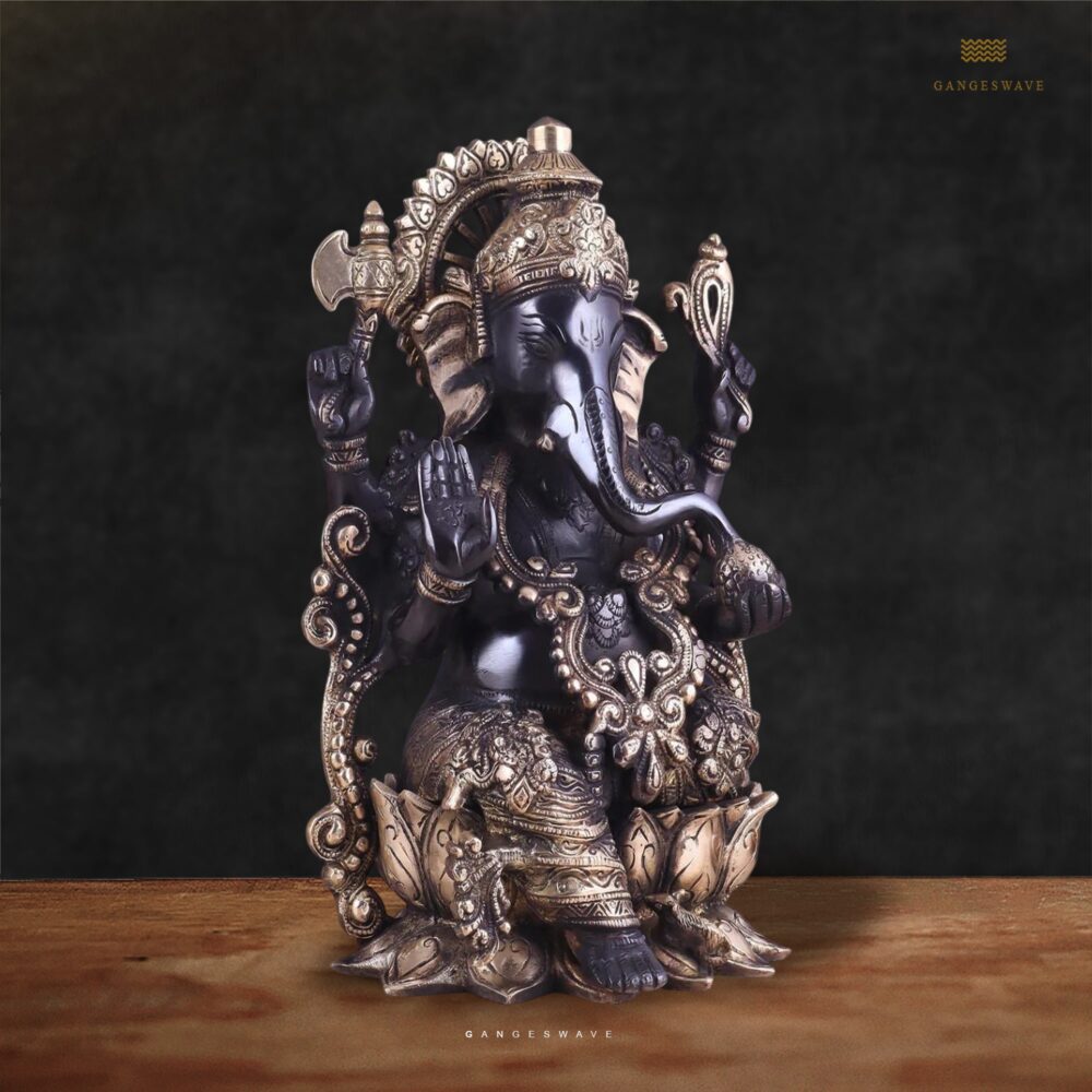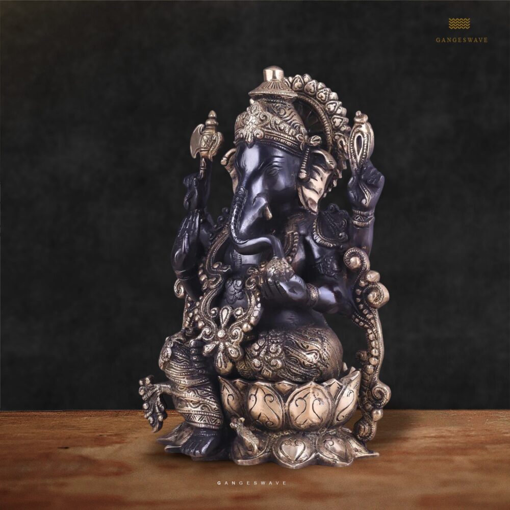 This beautiful Ganesh statue is made out of superfine brass with a vintage black patina finish. The intricate craftsmanship represent the legacy of the master artisans of India.