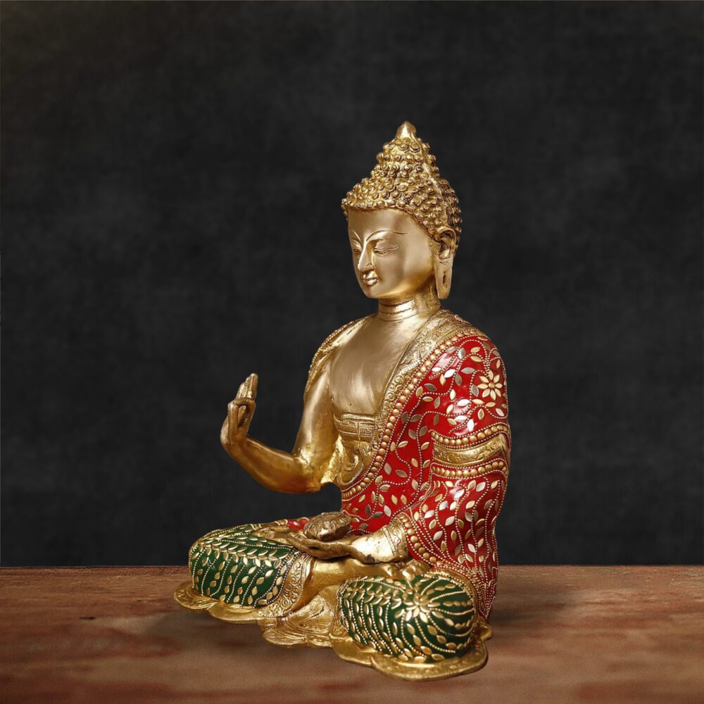 This exquisite Brass Buddha Statue adorned with intricate stone inlay work. Carefully handcrafted by skilled artisans, this statue captures the calm and meditative aura of Buddha, with vibrant stones inlaid throughout to enhance its beauty and craftsmanship.
