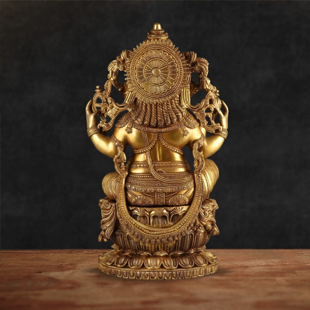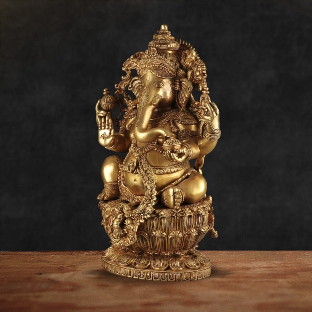 The Sitting Ganesha or  Ganesha in ‘Lalitasana’ represents a calm and relaxed deity. In sitting posture, he is meditating while keeping a watch over your family. Bring this Ganesha in your home to remove obstacles and be the protector of your family. Exclusively handcrafted in pure brass with lost wax technique by the artisans of Karnataka.
