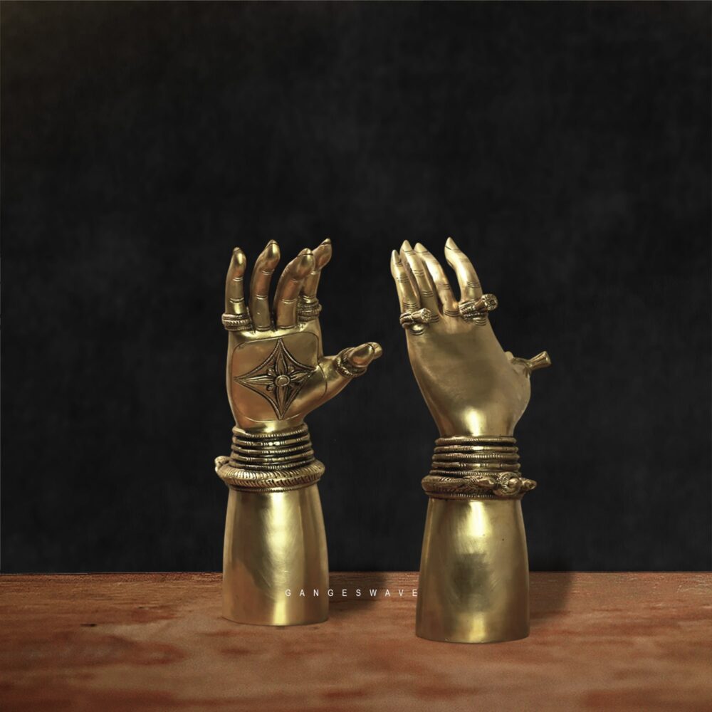 this Antique Brass Lady Hand Table Décor, a stunning collectible that celebrates traditional Indian artistry. Handcrafted in pure brass, this exquisite pair of lady hands is adorned with intricately detailed bangles and rings, symbolizing grace, beauty, and divine femininity.