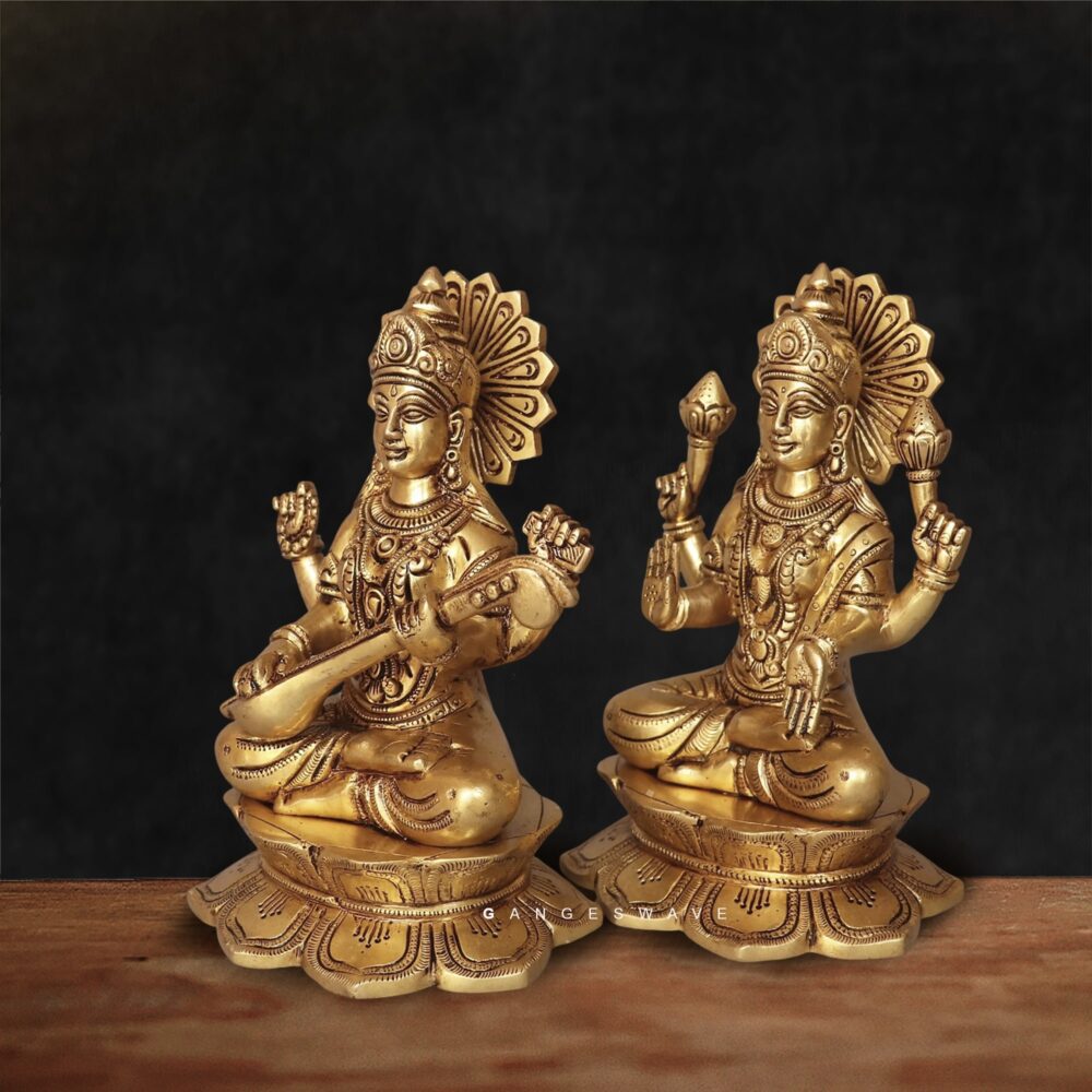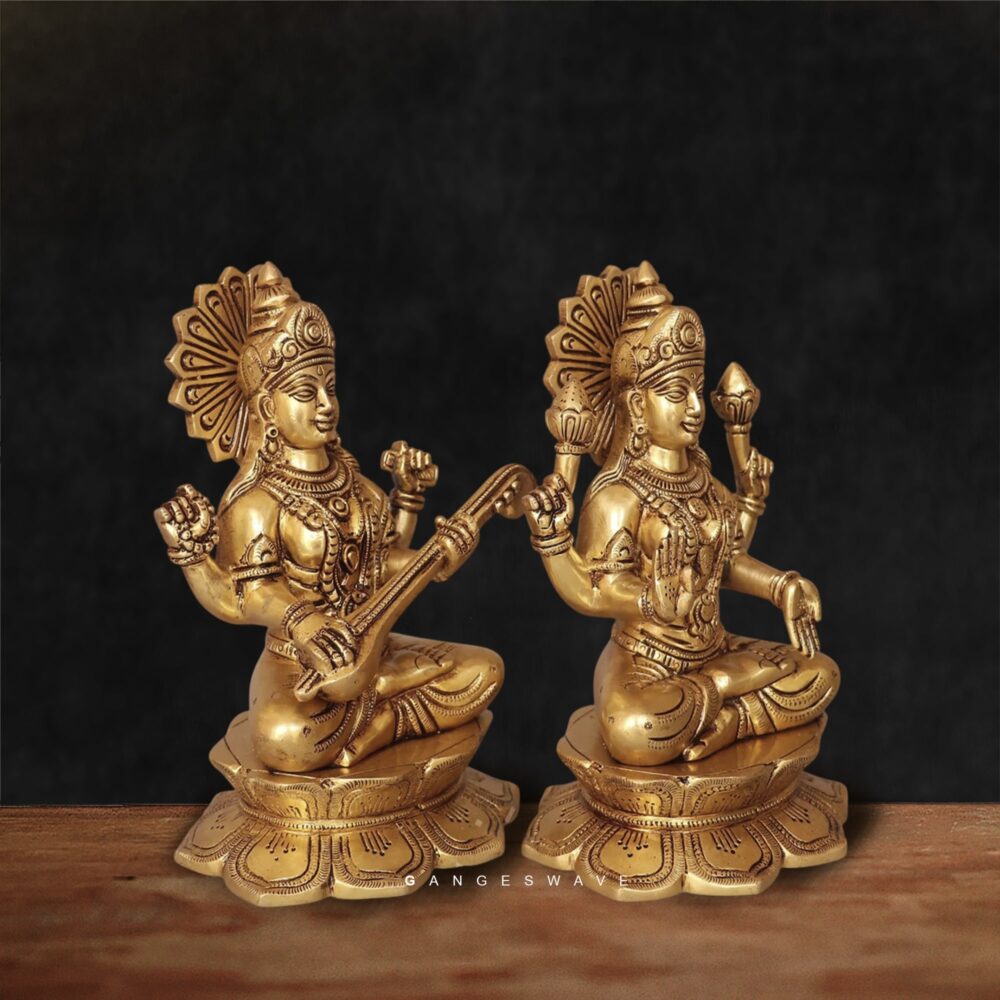 Brass Lakshmi Saraswati Idol Set – 8 inches