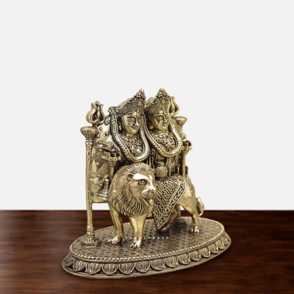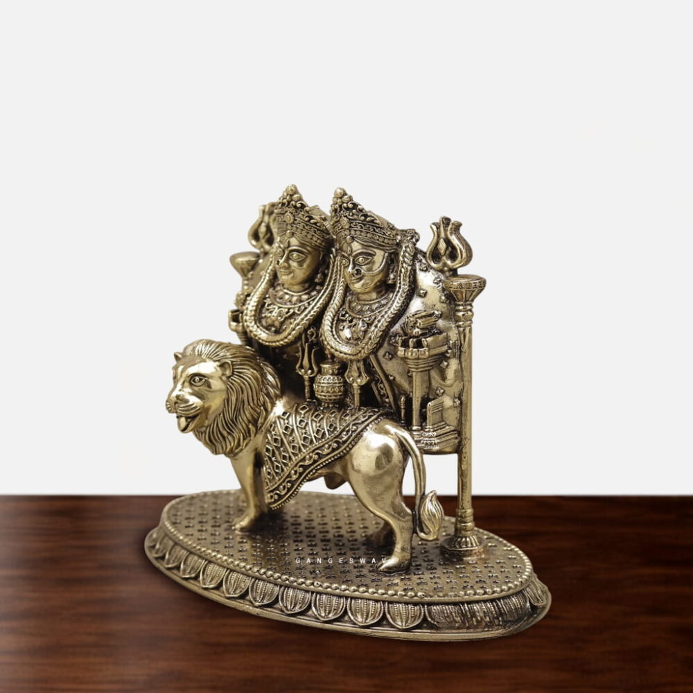 Maa Chamunda, a powerful manifestation of Durga, with this exquisitely handcrafted brass idol seated on a lion. Designed with intricate detailing and a rich antique finish, this sculpture is a perfect blend of spirituality and decor.