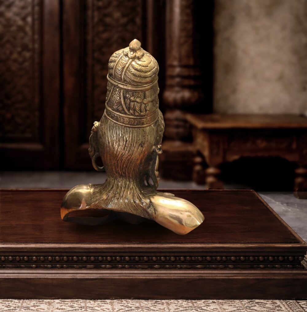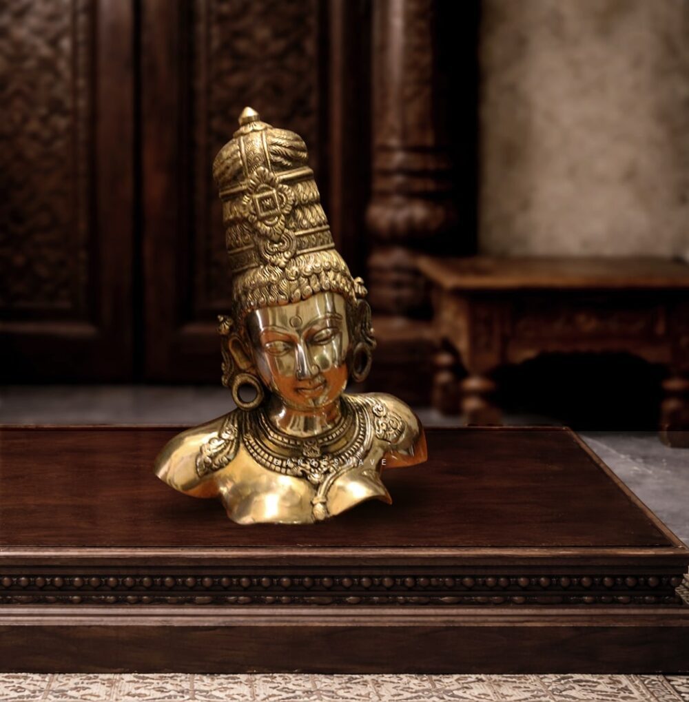 This elegant brass bust of Goddess Parvati, the embodiment of love, fertility, and divine strength, is a masterpiece of Indian artistry. Handcrafted using the traditional lost-wax casting method, it showcases intricate carvings and a serene expression that radiates spiritual calm. Ideal as a home decor centerpiece, yoga studio accent, or meaningful gift, this artifact adds a touch of sacred femininity to any space.