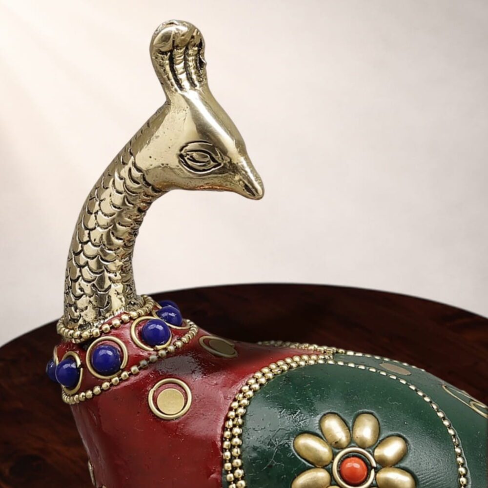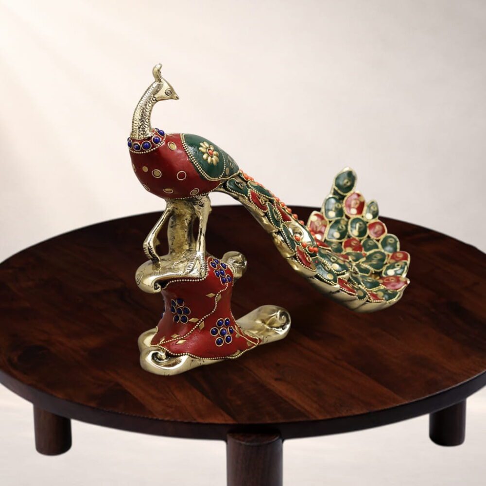The elongated, flowing tail with detailed stone inlay and floral motifs reflects meticulous handwork, while the rich jewel tones of red and green create a striking contrast against the antique brass finish. Whether styled as a luxury home décor accent, a festive centerpiece, or a collector’s artefact, this peacock sculpture instantly enhances the visual appeal of any space. Intricately adorned with vibrant Meenakari enamel work, this premium décor piece blends traditional Indian craftsmanship with modern luxury styling,
