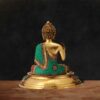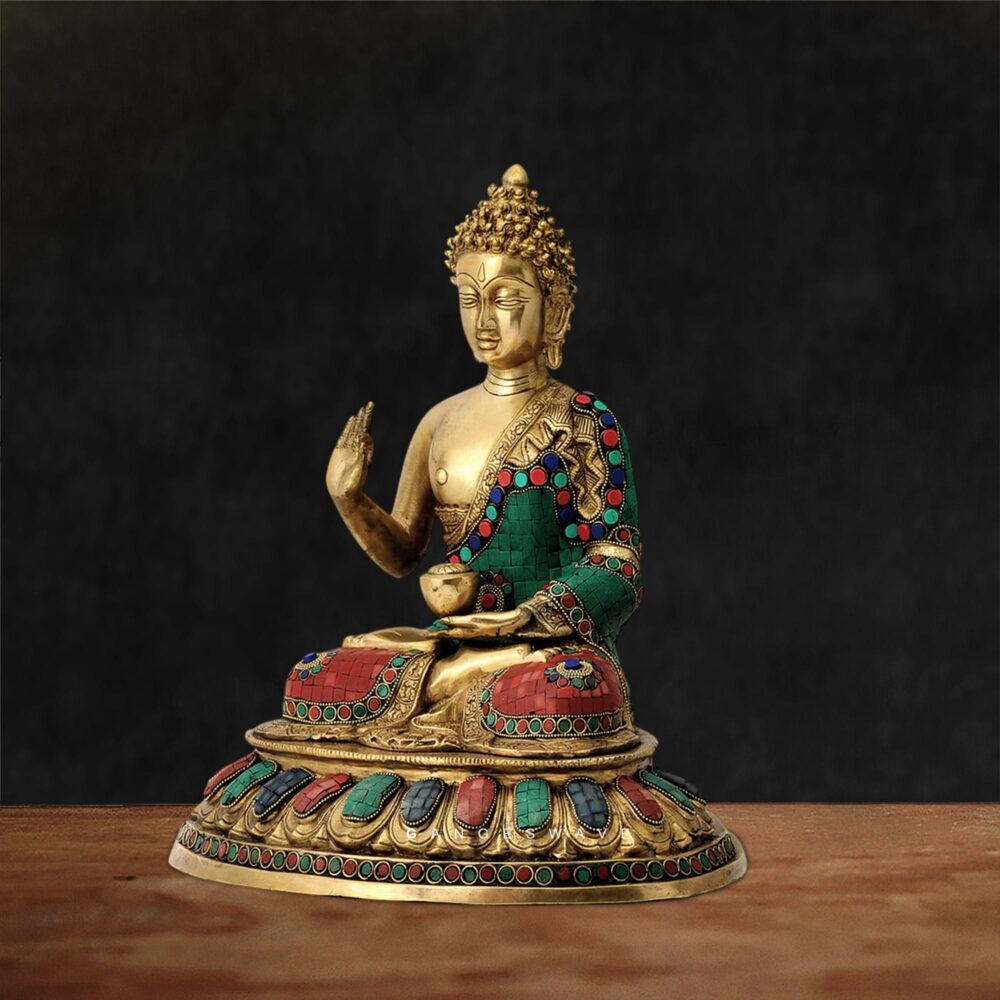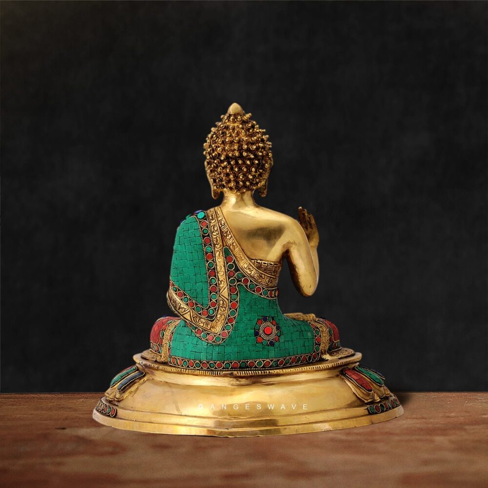 The Buddha is depicted in a blessing (Abhaya Mudra) posture, symbolizing protection, reassurance, and inner peace, while the other hand gently holds a bowl of alms, representing humility and compassion.  Meticulously sculpted by skilled Indian artisans, this statue features intricate semi-precious stone inlay work in vibrant turquoise, coral red, and deep blue tones, inspired by traditional Tibetan and Himalayan art.