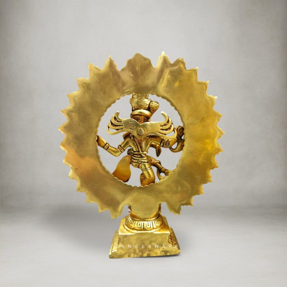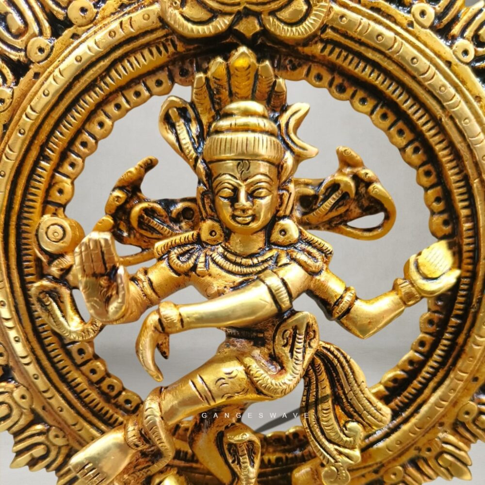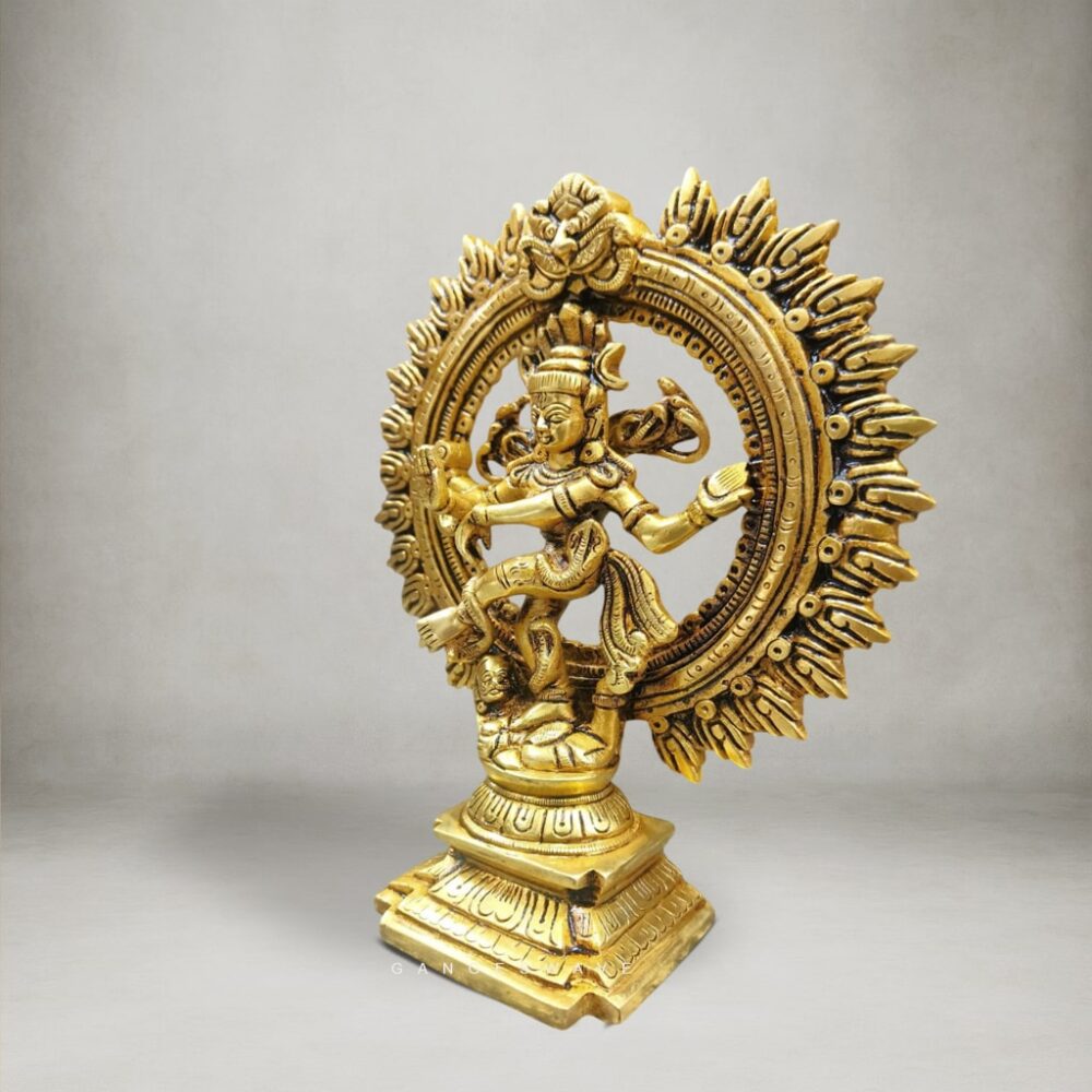 The idol features Shiva performing the Tandava, symbolizing creation, preservation, and destruction—making it a powerful addition to any sacred space. Its beautifully carved halo, expressive posture, and detailed ornaments reflect the skill of traditional Indian artisans.