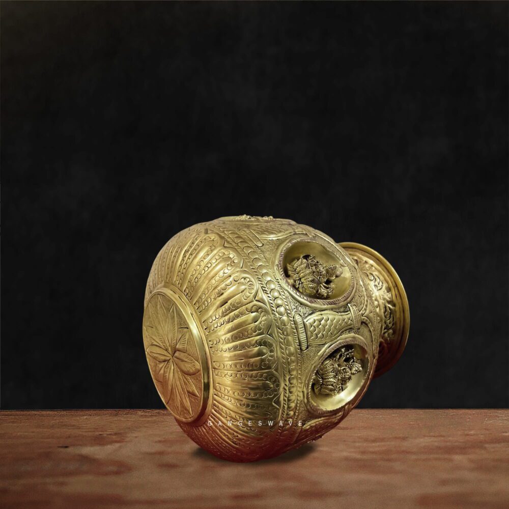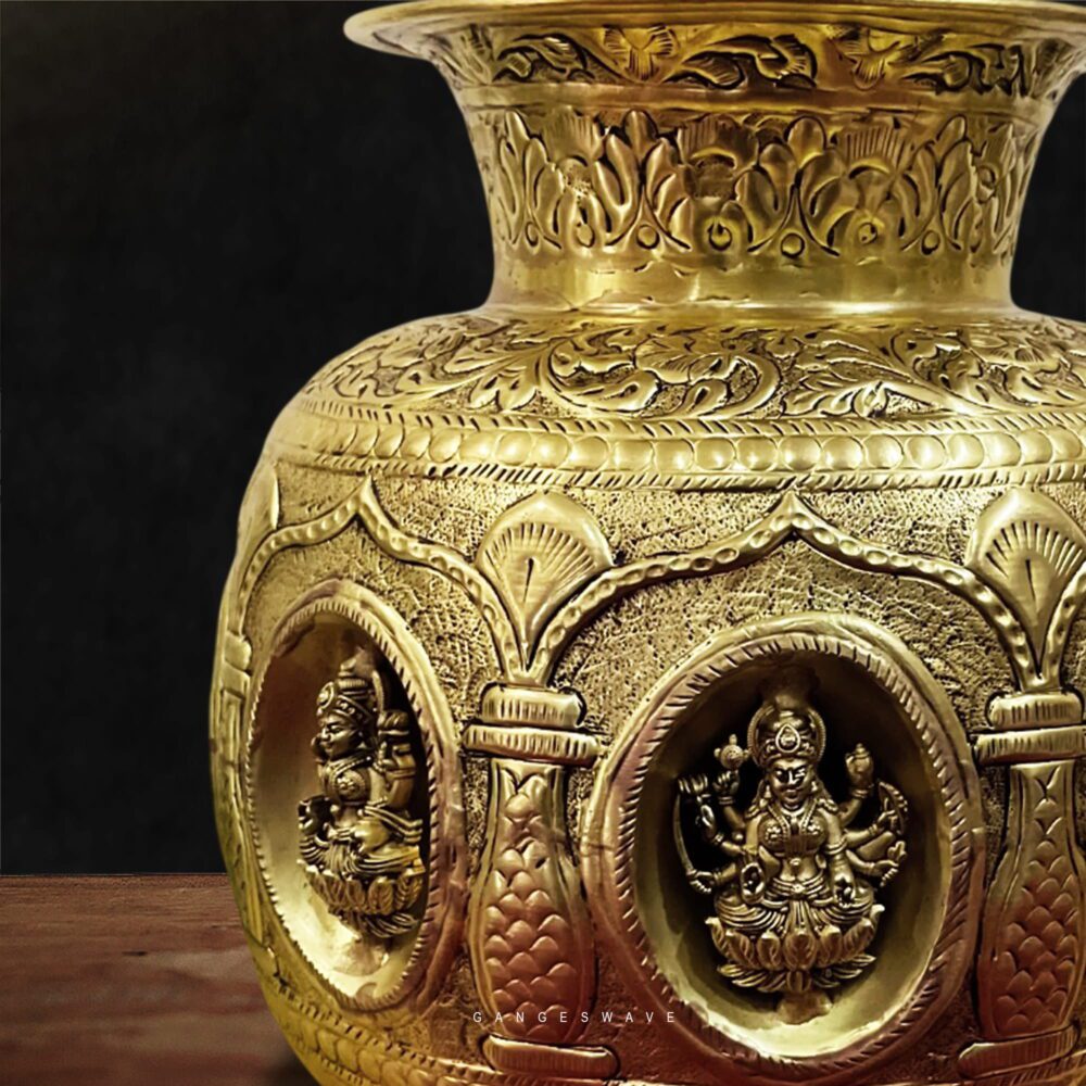 Brass Kalash featuring Goddess Lakshmi motifs, a symbol of prosperity, abundance, and auspicious beginnings. Made from high-quality solid brass, the kalash has a rich golden hue with a naturally antique finish that enhances its traditional appeal. The wide mouth and balanced form make it ideal for ritual use during pooja, weddings, griha pravesh, Diwali, Navratri, and other sacred ceremonies, while its artistic craftsmanship also makes it a striking heritage décor accent for homes, temples, and spiritual spaces.
