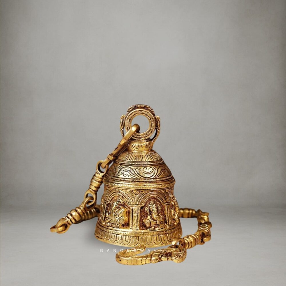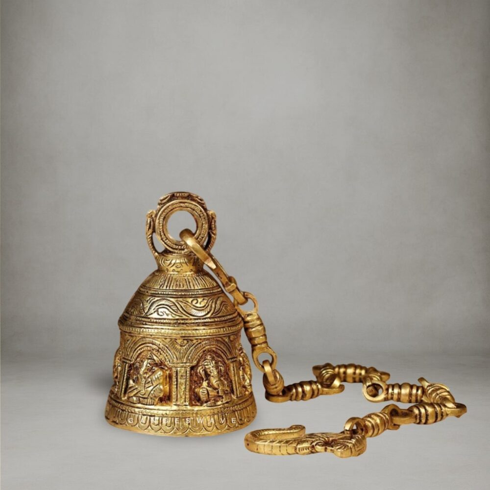 Handcrafted brass temple bell with intricate Ganesha carvings and ornate brass chain