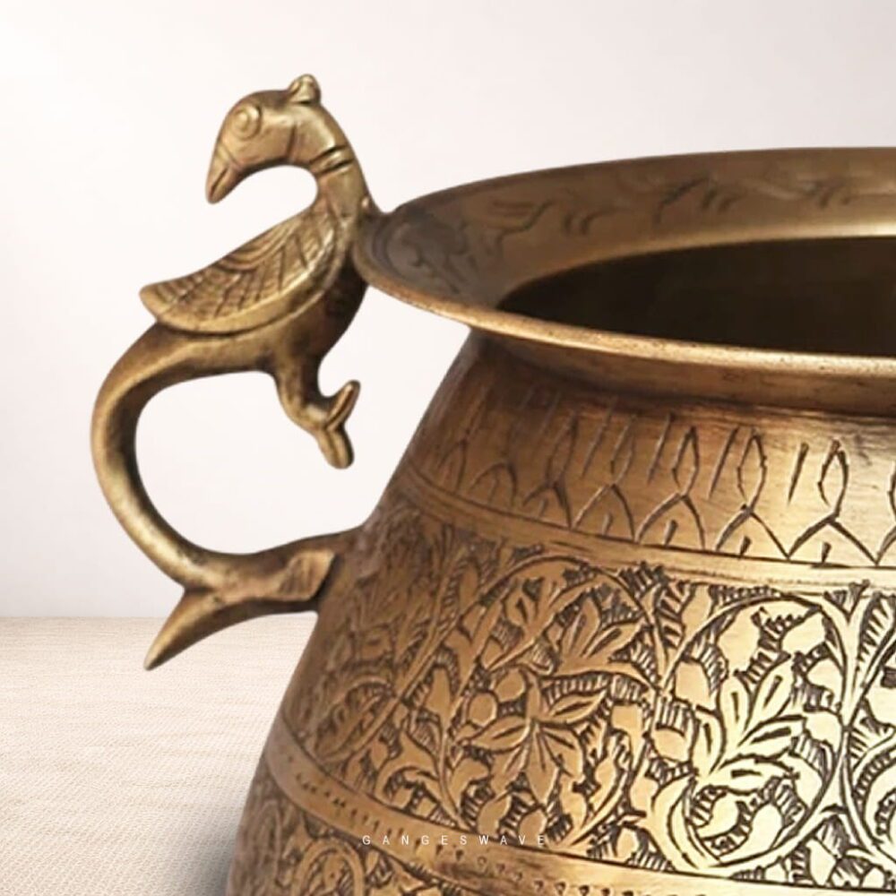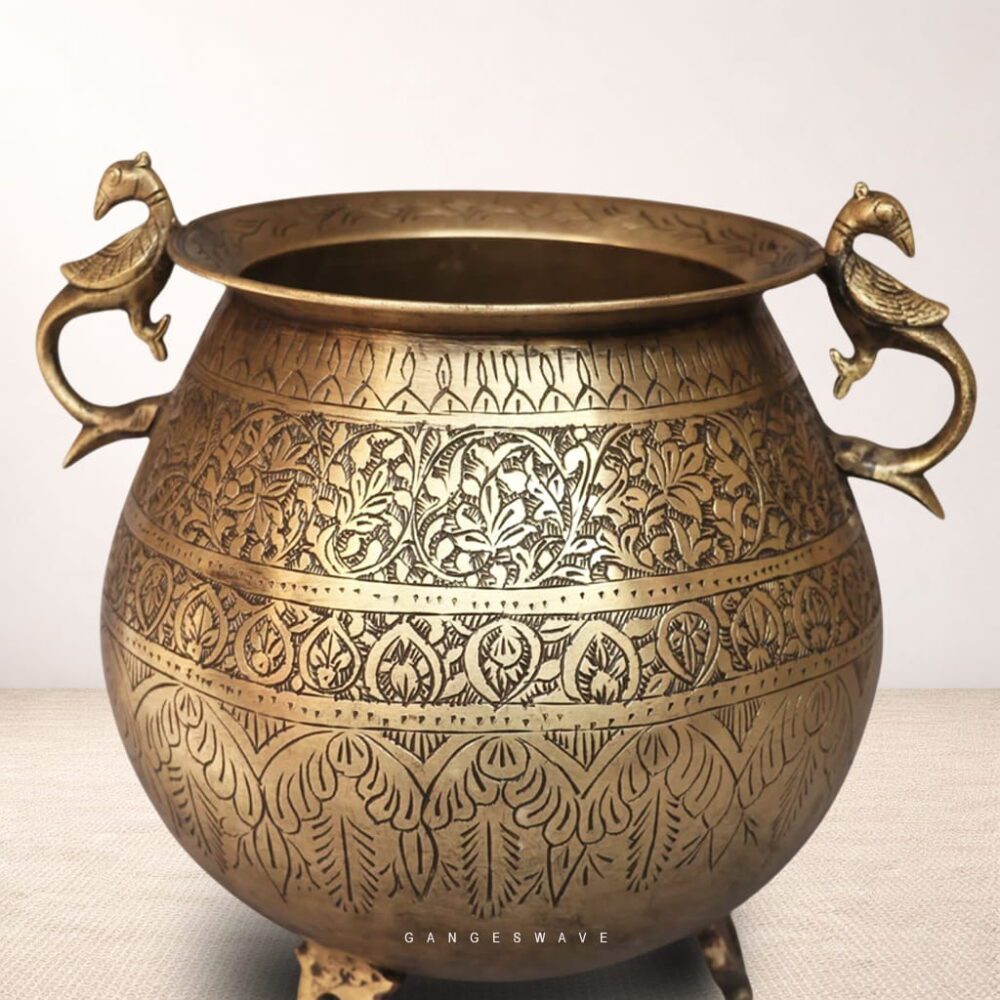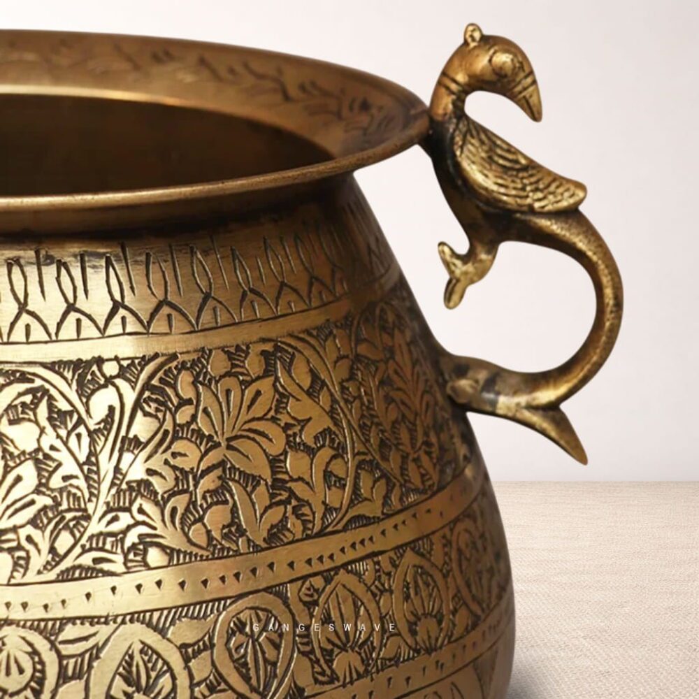 This handcrafted brass planter featuring an elegant lion head ring handle, a timeless piece that blends heritage craftsmanship with luxury décor aesthetics. Designed to stand on graceful brass legs, this planter adds royal charm and vintage sophistication to living rooms, entryways, studies, and curated interior spaces.