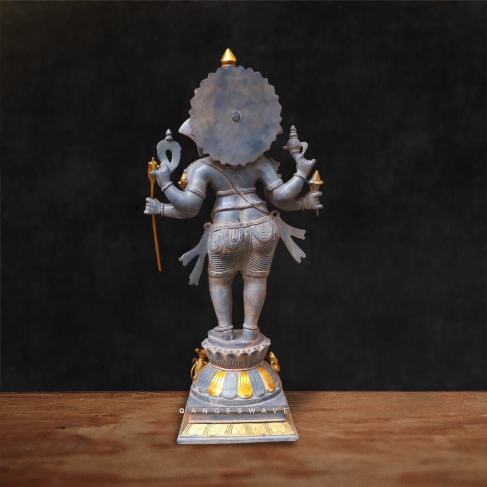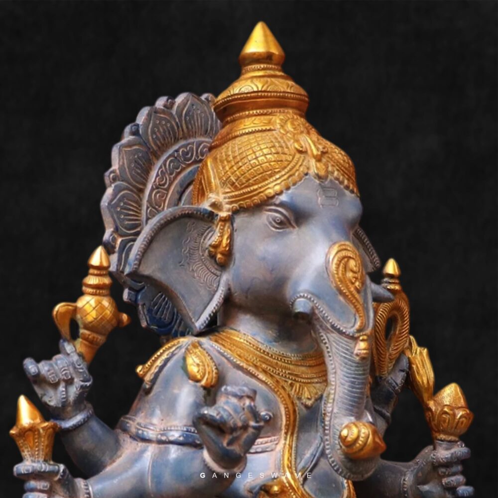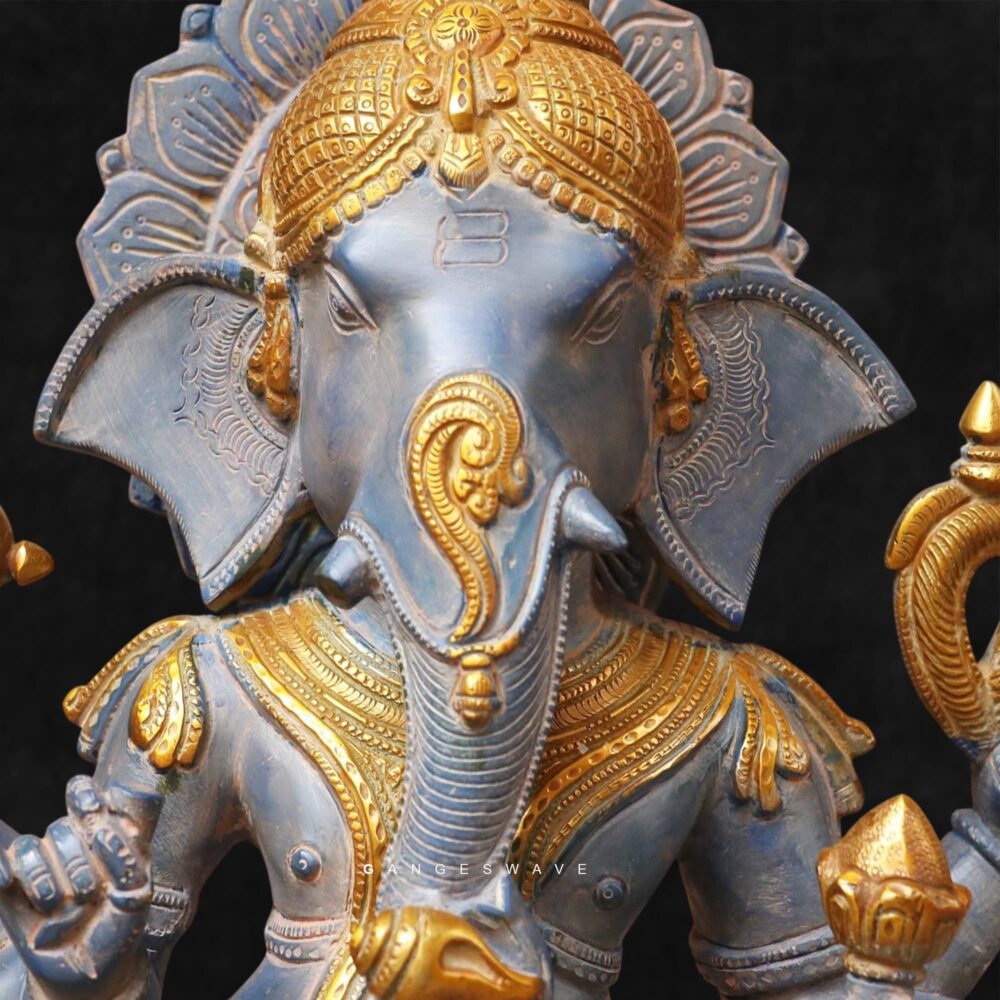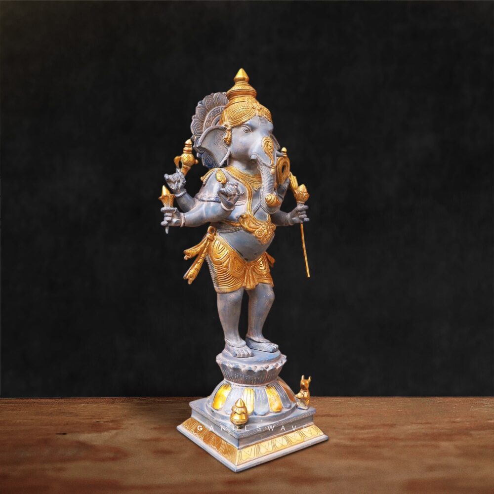 Depicting Lord Ganesha in a graceful standing posture, this premium idol features a sophisticated dual-tone finish in antique grey and rich gold highlights. The elegant hand-painted finish enhances depth and character, ensuring every piece feels timeless and collectible.