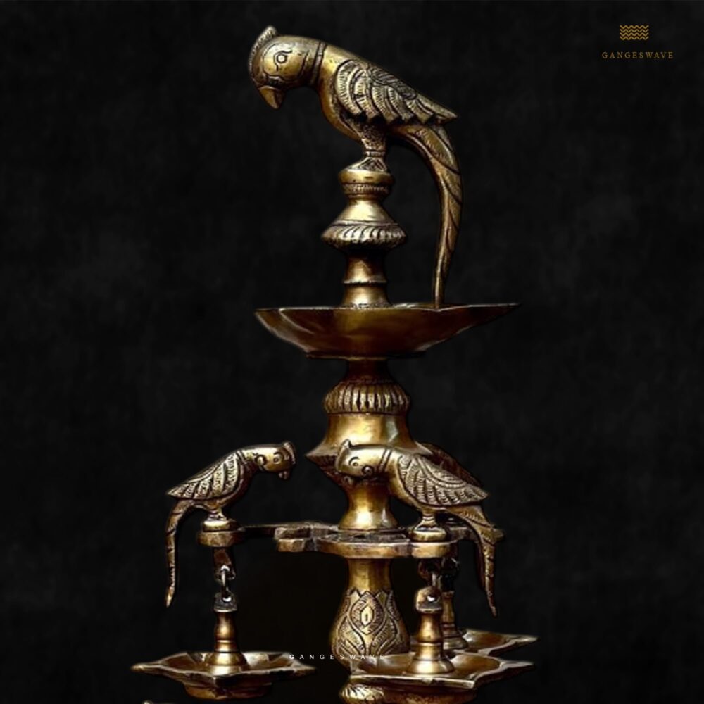 Illuminate your space with timeless elegance through this multi-layered brass parrot deepam, a masterpiece of traditional Indian metal artistry. Expertly handcrafted in solid brass, this majestic oil lamp features intricately sculpted parrots (kili) arranged across multiple tiers, symbolizing prosperity, divine energy, and spiritual awakening.