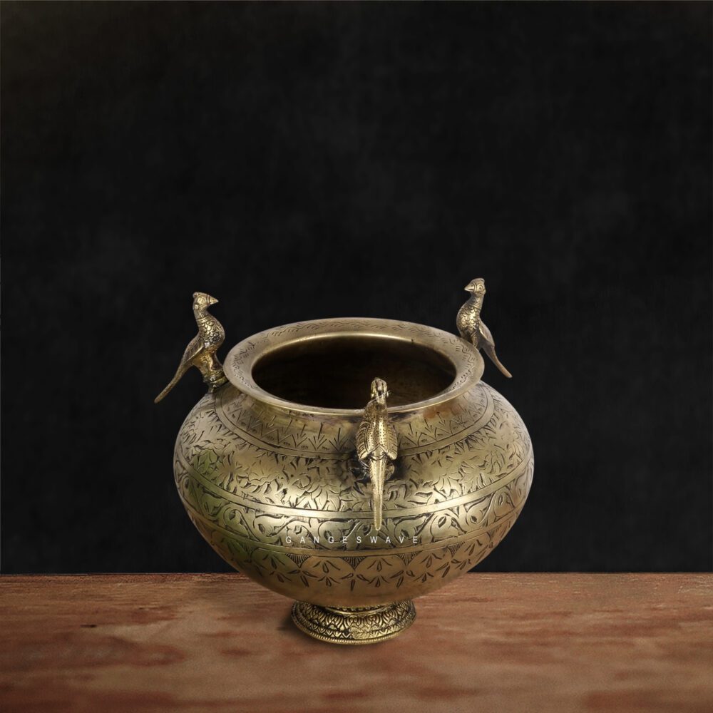 This handcrafted brass planter featuring intricate carving with peacock handle a timeless piece that blends heritage craftsmanship with luxury décor aesthetics. Designed to stand on graceful brass legs, this planter adds royal charm and vintage sophistication to living rooms, entryways, studies, and curated interior spaces.