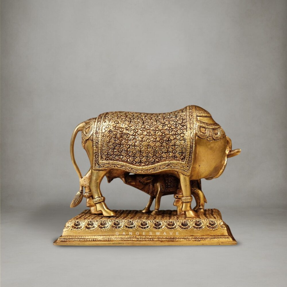 Handcrafted brass Kamdhenu cow and calf statue with intricate carvings on an engraved pedestal
