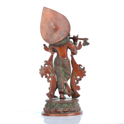 This exceptionally artistic statue is of Lord Krishna also known as Lord Vishnu. Vishnu pervades the entire universe as its soul. All the worlds depend on Vishnu for manifestation, existence and dissolution. While Vishnu has many forms, his four-armed form is most common, which this sculpture depicts. Flames around Shankha and Chakra are indicative of their aura and divinity. This bronze sculpture of Vishnu is very graceful and visually pleasing