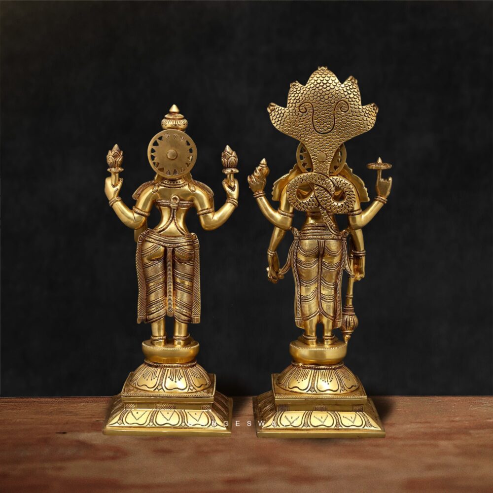 This premium handcrafted brass idol set of Lord Vishnu and Goddess Lakshmi. Made by skilled Indian artisans using traditional lost-wax casting techniques, these statues reflect intricate detailing, fine craftsmanship, and timeless artistry. Lord Vishnu Idol: Depicted with Sheshnag (serpent hood), Sudarshana Chakra, and Gada, symbolizing cosmic balance and protection. Goddess Lakshmi Idol: The goddess of wealth and fortune, holding lotus flowers that signify purity, abundance, and auspiciousness.