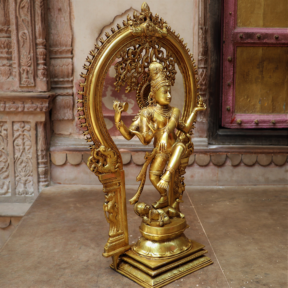 This exquisite statue of lord Krishna is inspired by the age-gold chola technique. Although, the statue personify the aura of Krishna and his charm holding the flute, but more so ever the mukut is done according to the mythological references way back centuries.