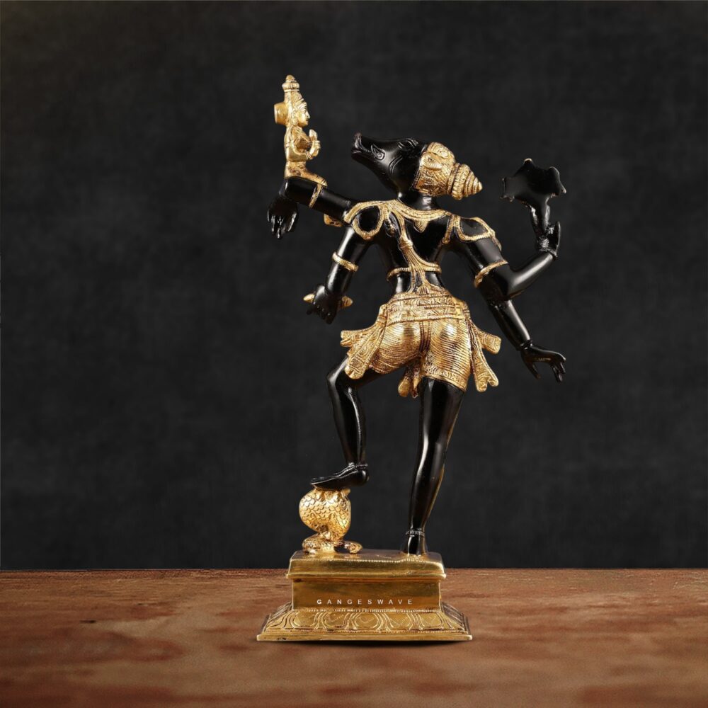 This superior-quality brass statue depicts Lord Vishnu in his Varaha avatar, showcasing intricate craftsmanship with a striking black and gold finish.
