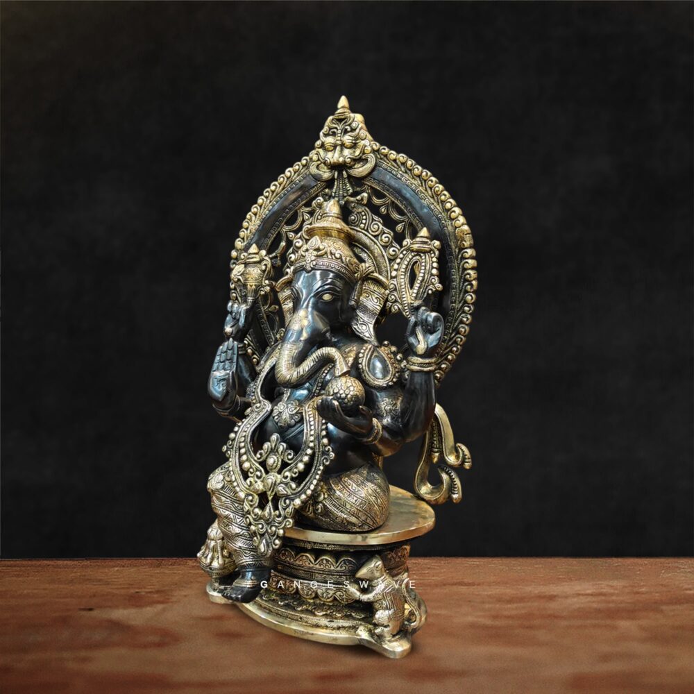 Handcrafted Antique Brass Lord Ganesha Murti, an exquisite symbol of wisdom, prosperity, and auspicious beginnings. This meticulously detailed Ganpati idol is crafted from premium quality brass by skilled artisans, showcasing traditional Indian artistry with intricate carvings and antique finish.