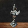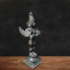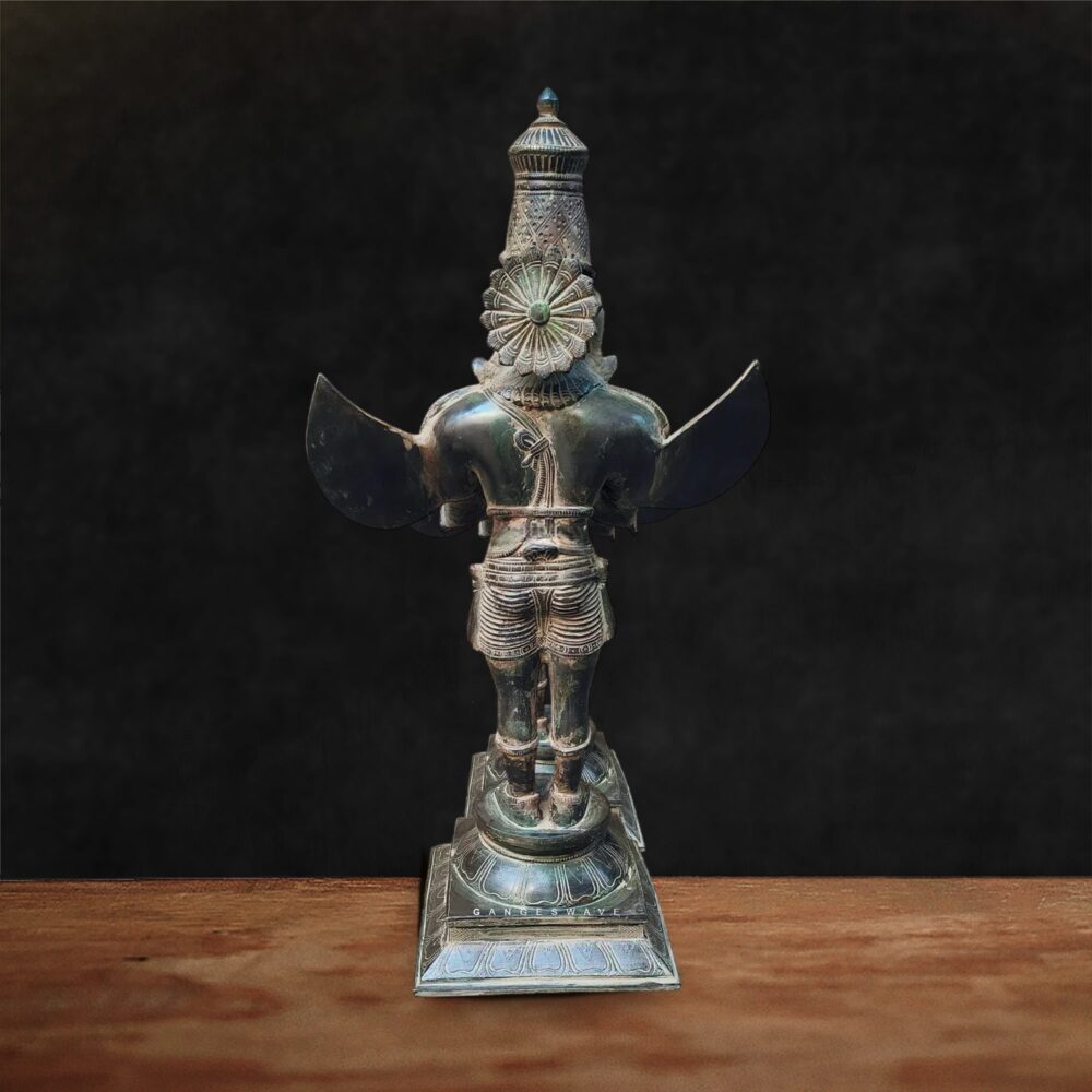 Garuda is a huge, mythological bird-like or human-like monster that occurs in both Buddhist and Hindu mythology. Hinduism describes Garuda as a divine deity. He is Lord Vishnu’s vahana, or mount, and is frequently shown as a man with wings. This magnificent Garuda is portrayed in greetings posture wings spread wide and her hands folded. It was cast in brass using the lost wax process. The sculpture is even more beautiful and has more personality with the unique black patina finish.
