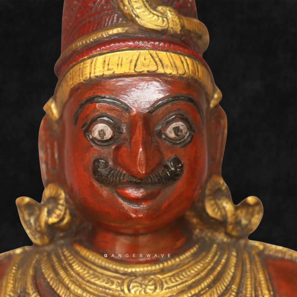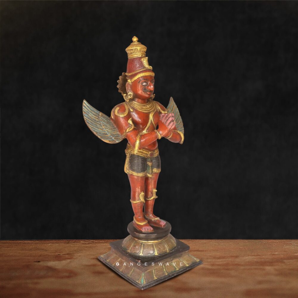 Garuda is a huge, mythological bird-like or human-like monster that occurs in both Buddhist and Hindu mythology. Hinduism describes Garuda as a divine deity. He is Lord Vishnu’s vahana, or mount, and is frequently shown as a man with wings. This magnificent Garuda is portrayed in greetings posture wings spread wide and her hands folded. It was cast in brass using the lost wax process. The sculpture is even more beautiful and has more personality with the unique black patina finish.