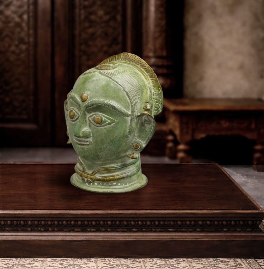Cast in solid brass and finished with a natural antique green patina accented with muted gold detailing, this sculpture embodies spiritual depth, cultural authenticity, and aesthetic sophistication. The finely detailed eyes, urna (forehead mark), earrings, and crown showcase traditional metalworking techniques passed down through generations.