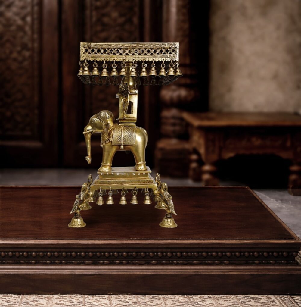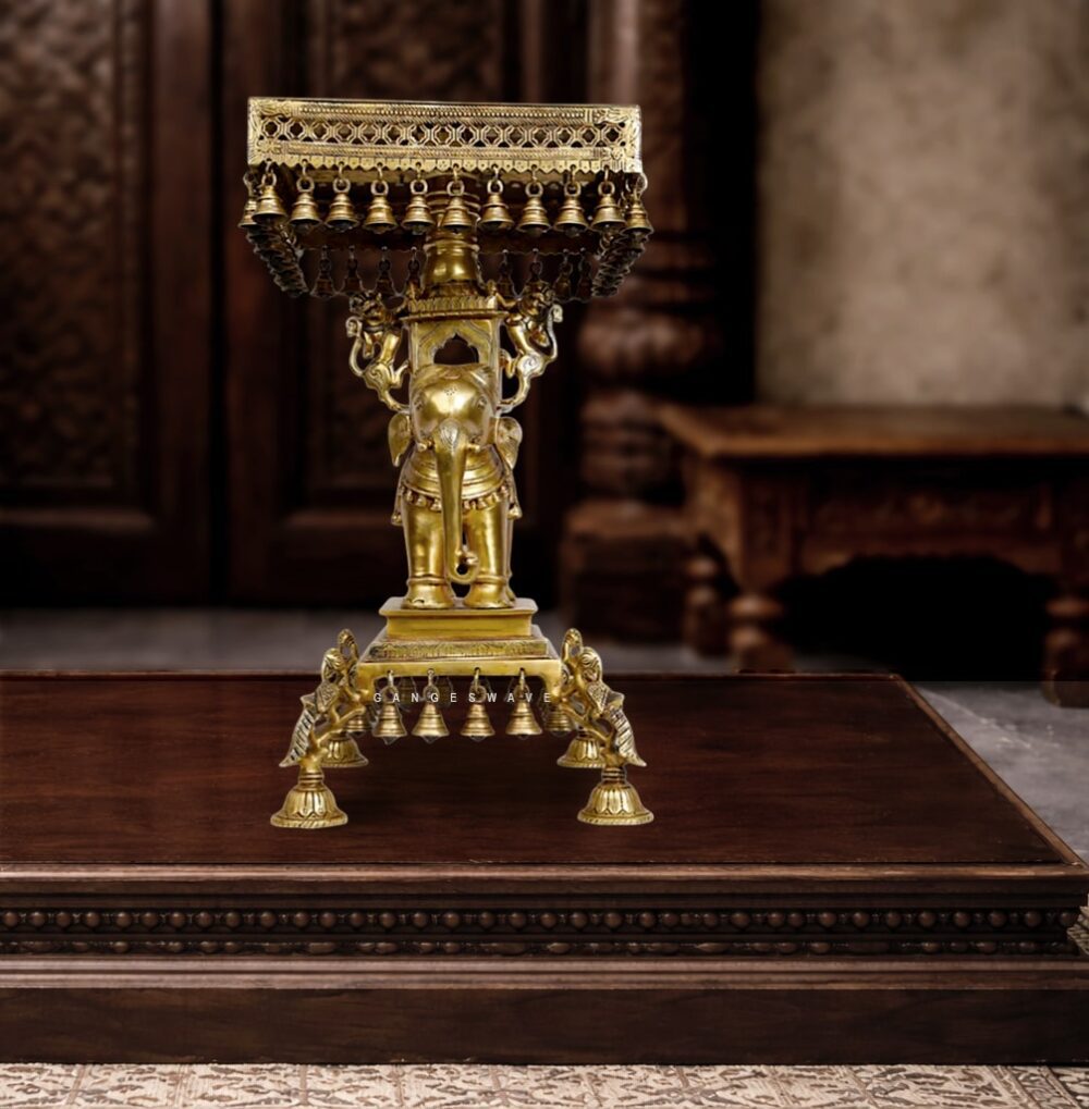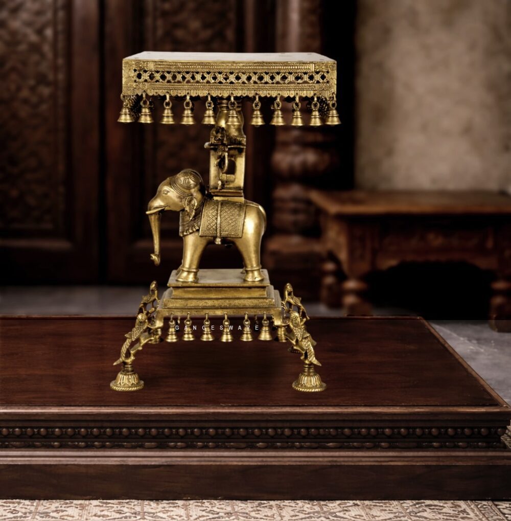 Handcrafted Brass Elephant Side Table with Bells – 23 inches