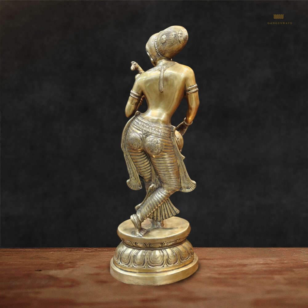 Brass lady figurine holding Veena, a masterpiece of fine craftsmanship that exudes elegance, poise, and timeless charm. Meticulously handcrafted by skilled artisans, this decorative brass statue showcases intricate detailing, capturing the grace of a woman admiring her own reflection.