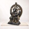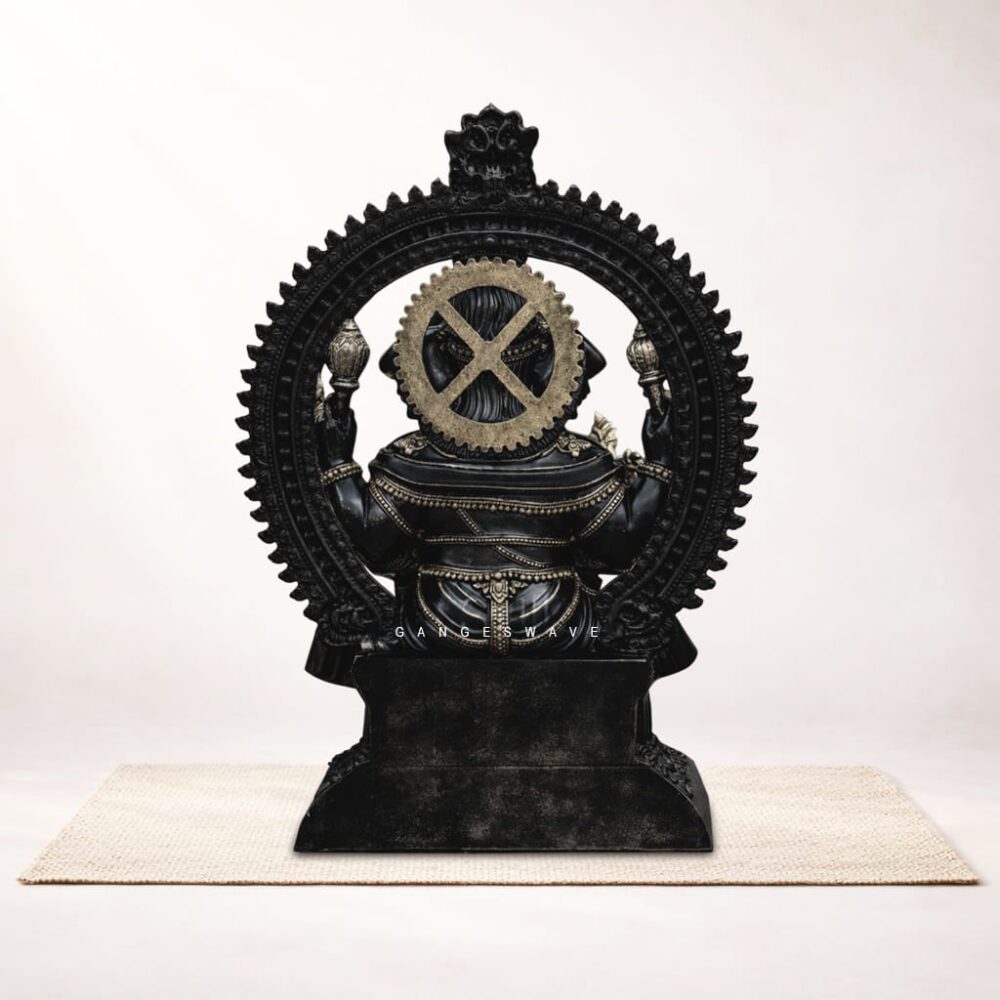 The statue features exceptional detailing, from the intricately carved crown and jewellery to the majestic circular prabhavali (aura arch) that enhances its spiritual presence. The antique black base tone, highlighted with subtle muted gold accents, gives the idol a rare, museum-grade finish that blends tradition with sophistication.