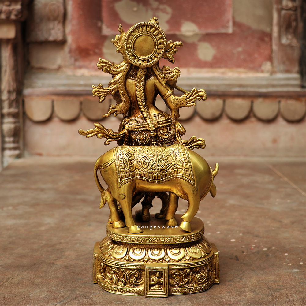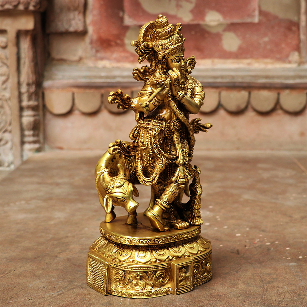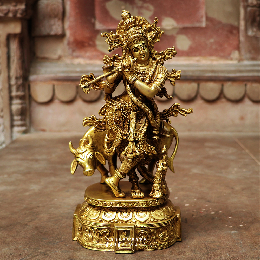 This beautiful statue of Lord Krishna with cow is crafted in chola style. Made with lost wax technique and detailed craftsmanship, the statue is certainly a treasure .