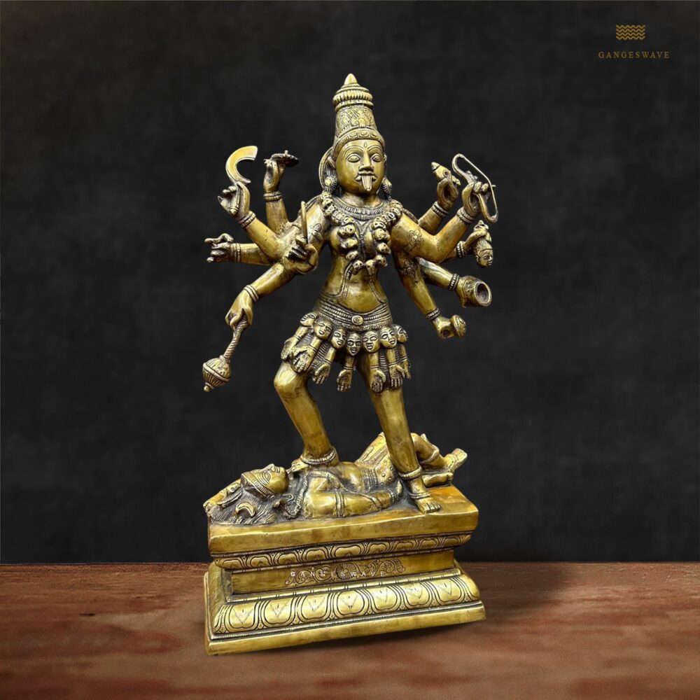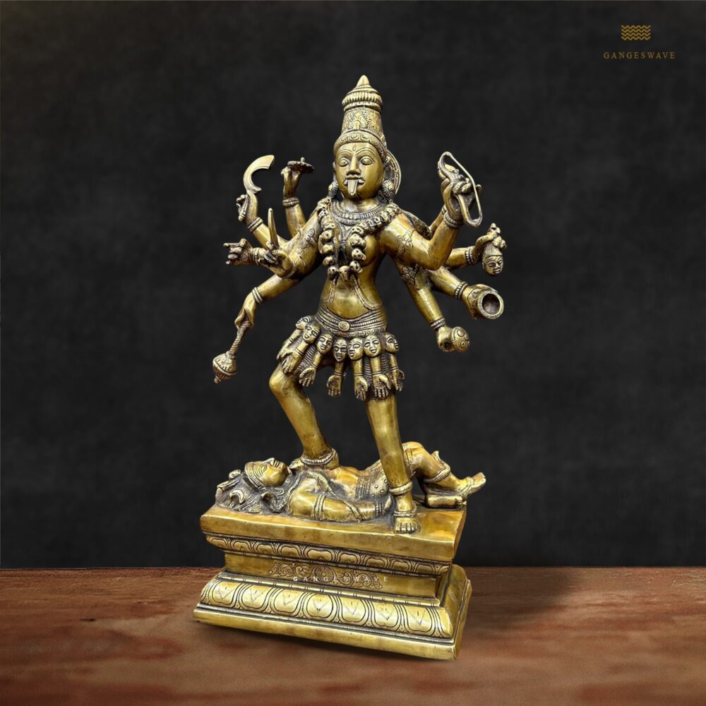 The unusual color combination adds a unique charm, setting this statue apart from traditional representations. The brass surface is adorned with vintage hues that blend harmoniously, creating a striking visual appeal. Standing as a testament to exceptional artistry, this Brass Kali Statue is more than just a decorative piece; it is a symbol of spiritual strength and devotion.