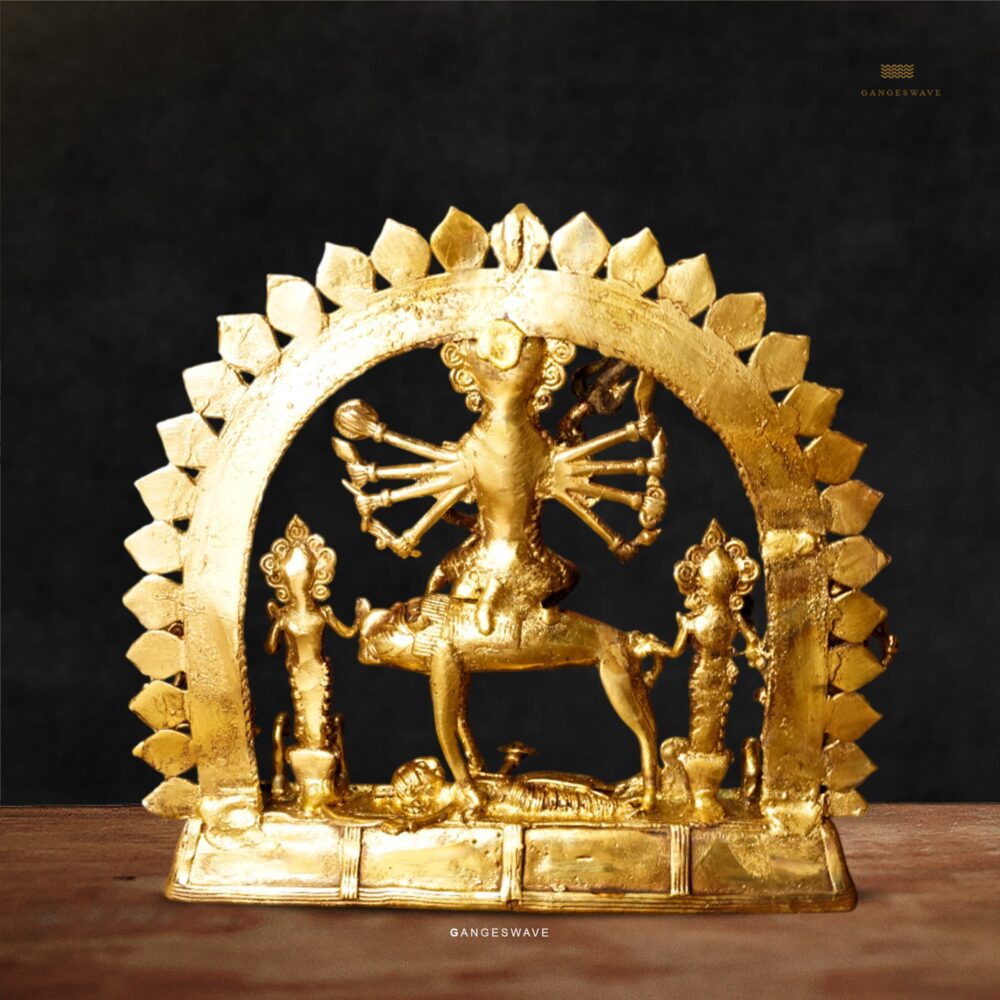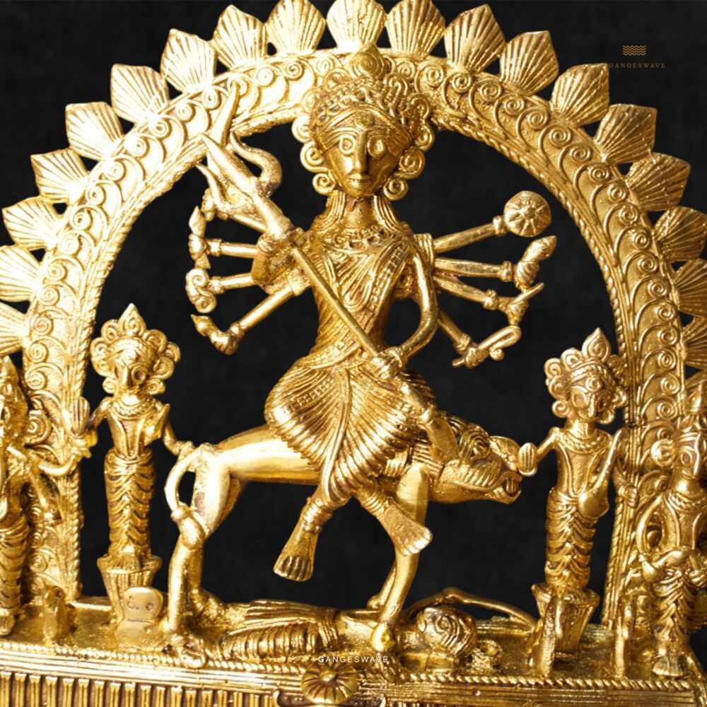 This Dhokra Ma Durga brass idol showcases the goddess slaying Mahishasura, crafted in traditional tribal style. Made using the ancient lost-wax method, it radiates cultural heritage and spiritual strength—ideal for festive décor, sacred spaces, or art collections. A powerful blend of symbolism and handcrafted elegance.