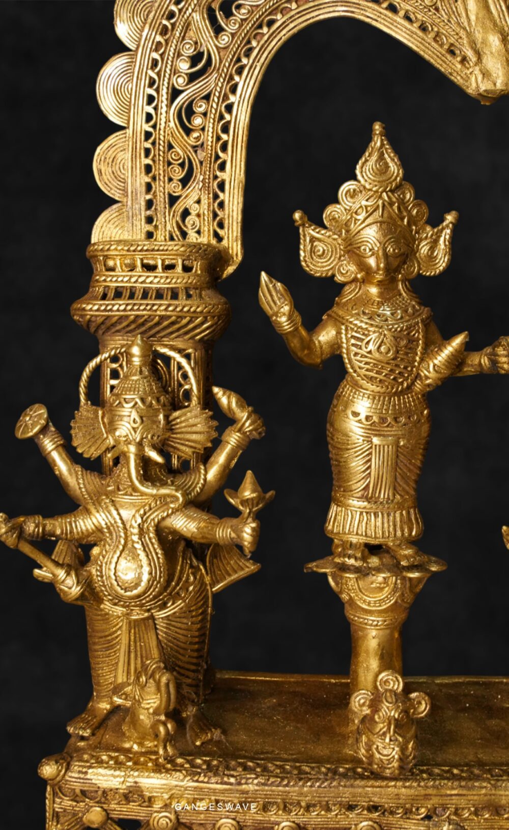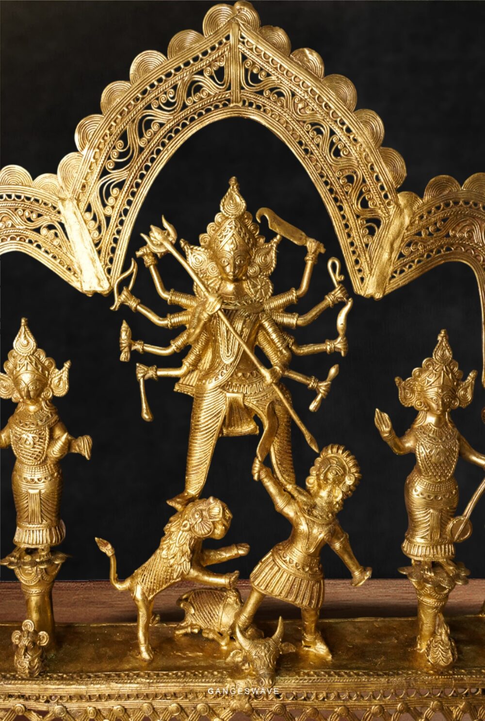 This Dhokra Ma Durga brass idol showcases the goddess slaying Mahishasura, crafted in traditional tribal style. Made using the ancient lost-wax method, it radiates cultural heritage and spiritual strength—ideal for festive décor, sacred spaces, or art collections. A powerful blend of symbolism and handcrafted elegance.