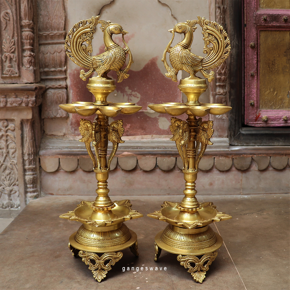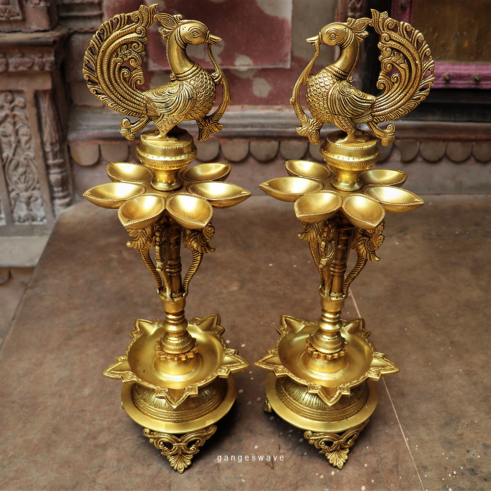 Adored with peacock, this pair of brass oil lamp diya is made in pure brass by the artisans of Karnataka. A perfect piece of puja decor to ignite your divine spirit.