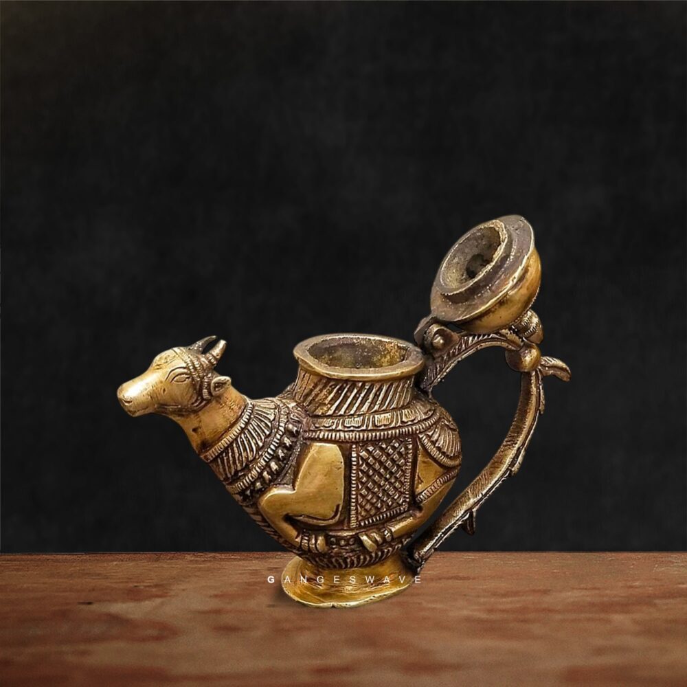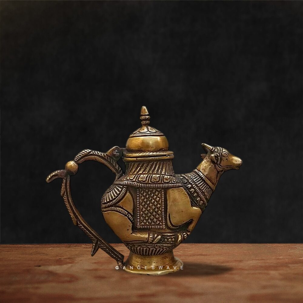 Brass Nandi Gangajal Pot, intricately handcrafted by skilled Indian artisans. This sacred vessel features a beautifully sculpted Nandi — the revered bull and divine gatekeeper of Lord Shiva — making it an auspicious addition to your spiritual rituals and home decor.