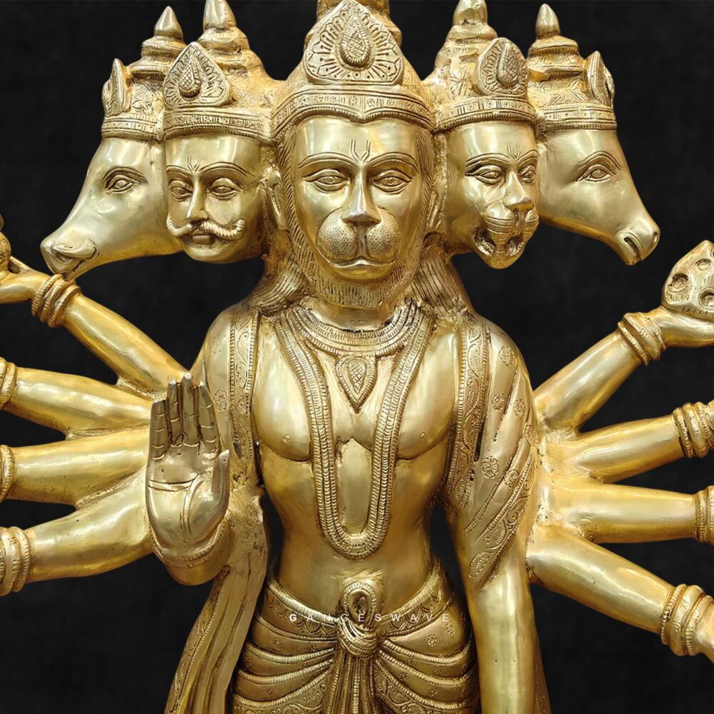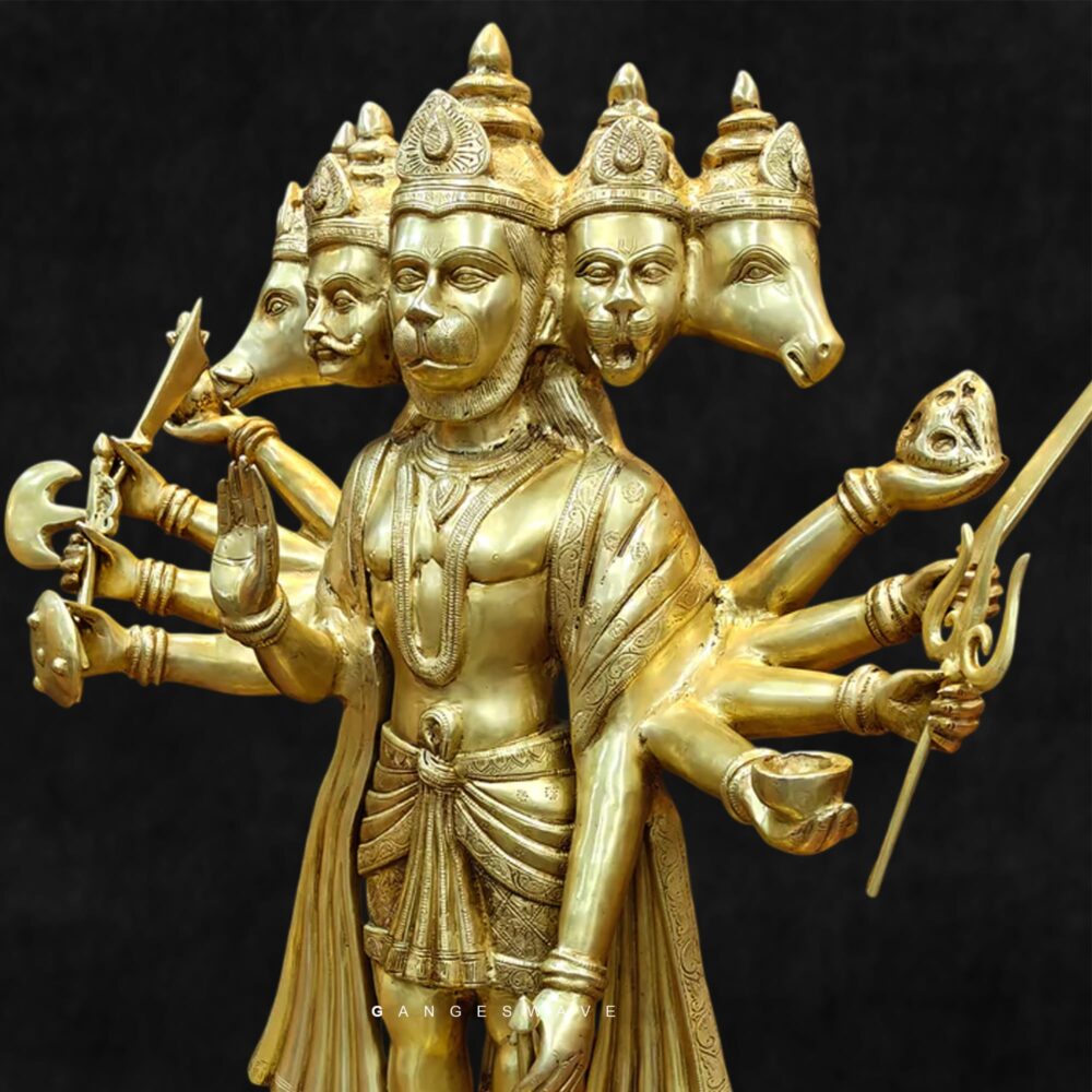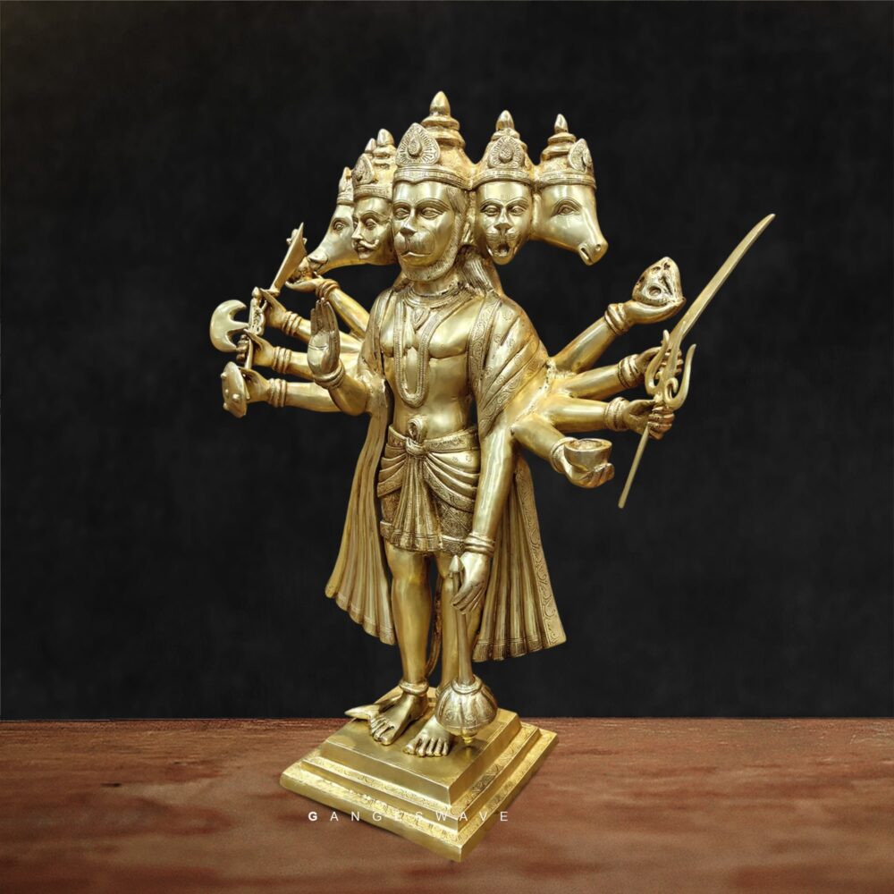 This five-faced Hanuman idol represents Lord Hanuman in his most powerful form — symbolizing courage, intelligence, righteousness, and victory over evil. Each face (Hanuman, Narasimha, Garuda, Varaha, and Hayagriva) radiates divine energy, crafted meticulously in pure brass to reflect timeless artistry and devotion.