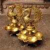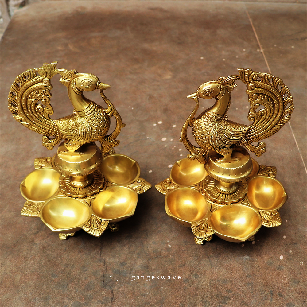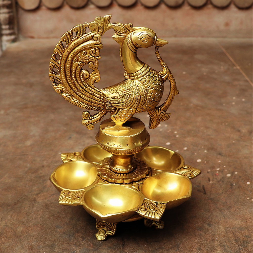 An exquisite peace of artistic brass oil lamp or Kuthu Vilakkus as they are often known as traditionally with a majestic peacock and floral pattern handcrafted by the artisans of South India.