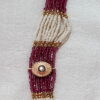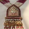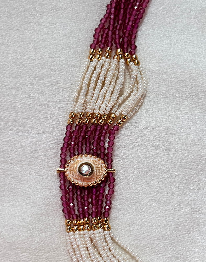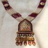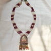 This traditional temple jewellery necklace set showcases exquisite craftsmanship inspired by South Indian heritage designs. The necklace features multiple strands of fine ivory beads beautifully contrasted with deep ruby-toned bead accents, creating a regal and balanced aesthetic.