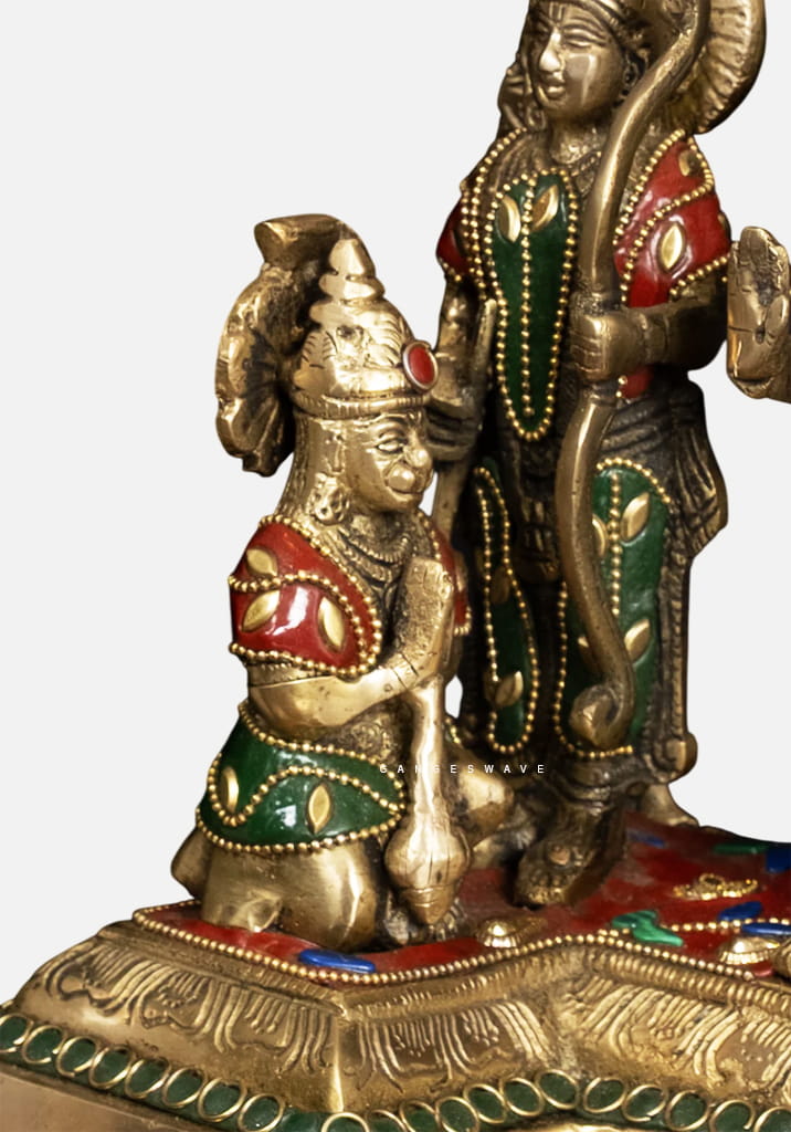 This exquisite statue of Ram Datbar family is meticulously crafted by skilled artisans using premium quality brass, adorned with vibrant red, blue, green, and white stone embellishments that highlight the deities  divine attire and ornaments. The elegant detailing and radiant finish make the idol a captivating piece of traditional Indian sacred art.
