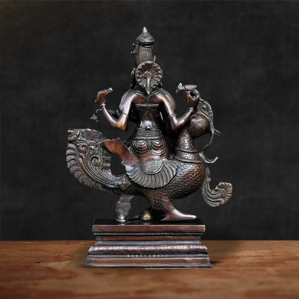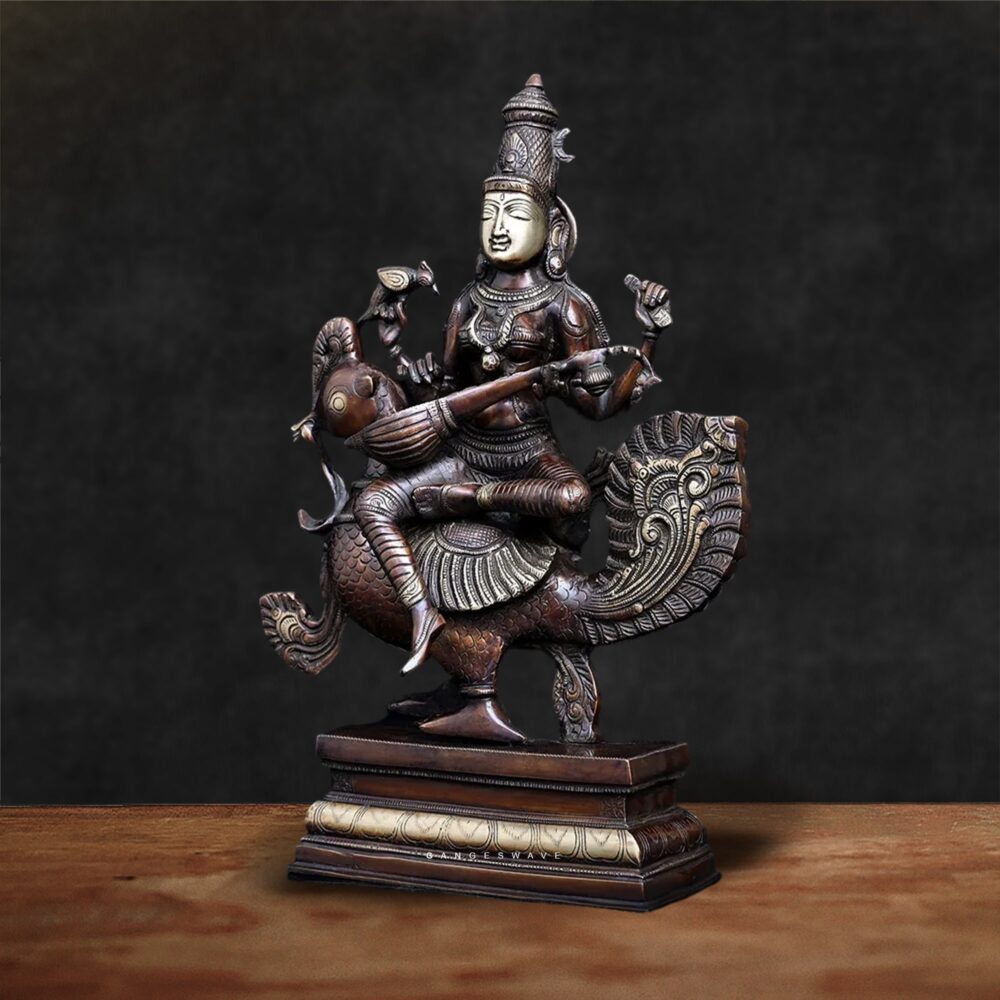 Exquisitely crafted in South Indian style, this brass Saraswati statue showcases the goddess seated gracefully on a peacock, embodying elegance and divine wisdom. A stunning addition to any sacred space.