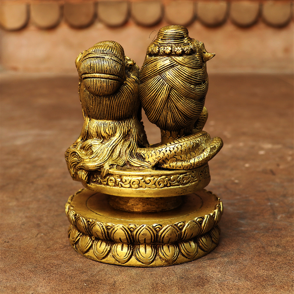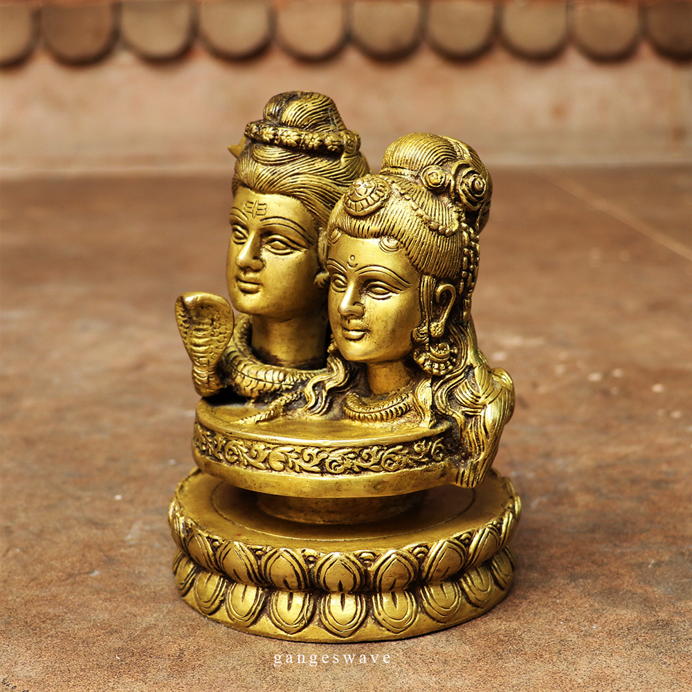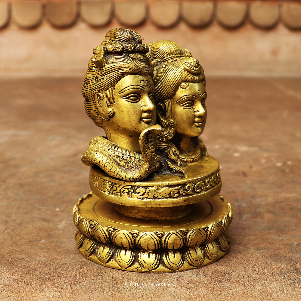 This is a unique combination of Shiva Parvati statue on lotus base. Perfect for any puja alter or esthetics decor. The statue is made of brass using the lost wax technique.